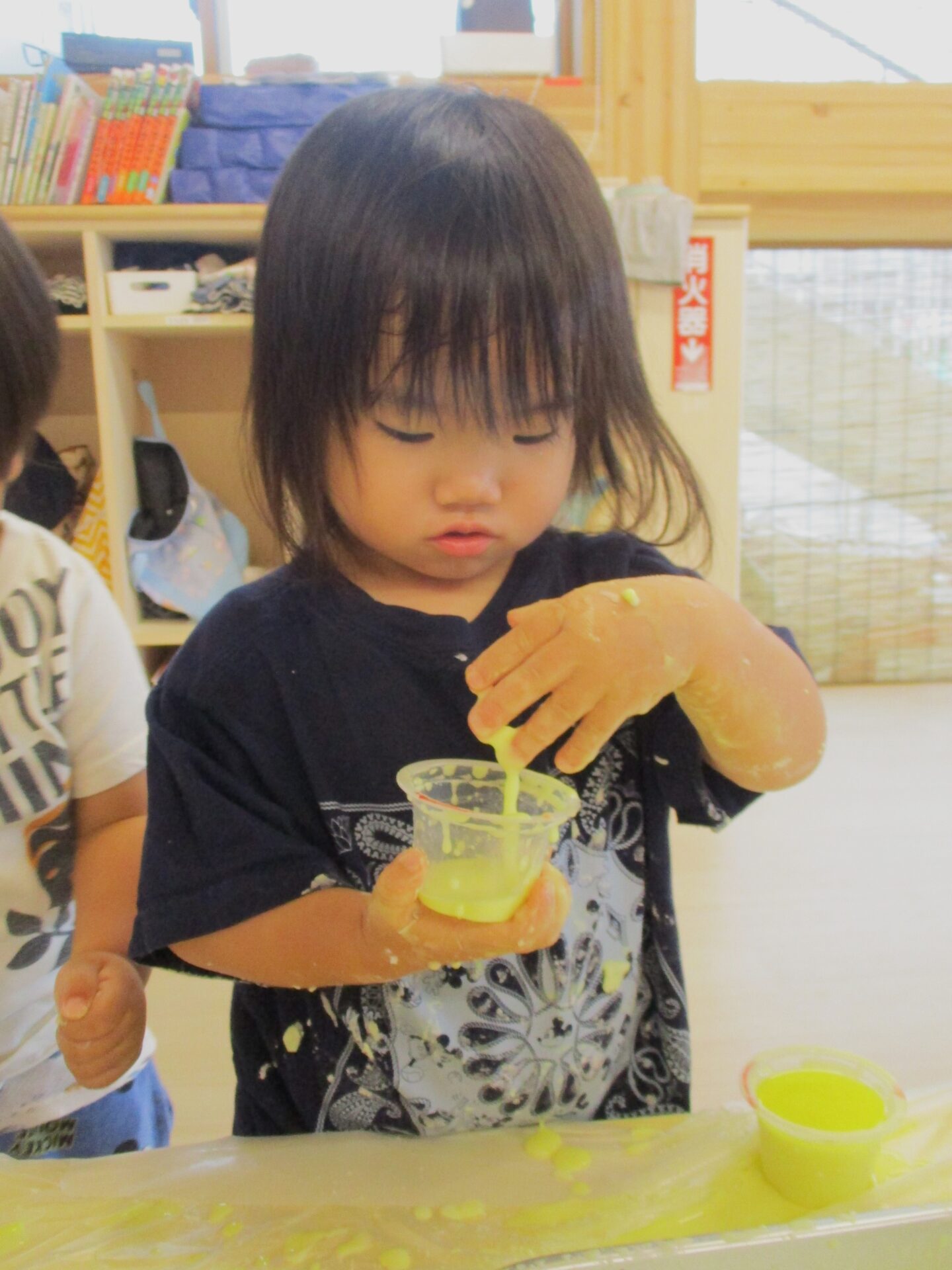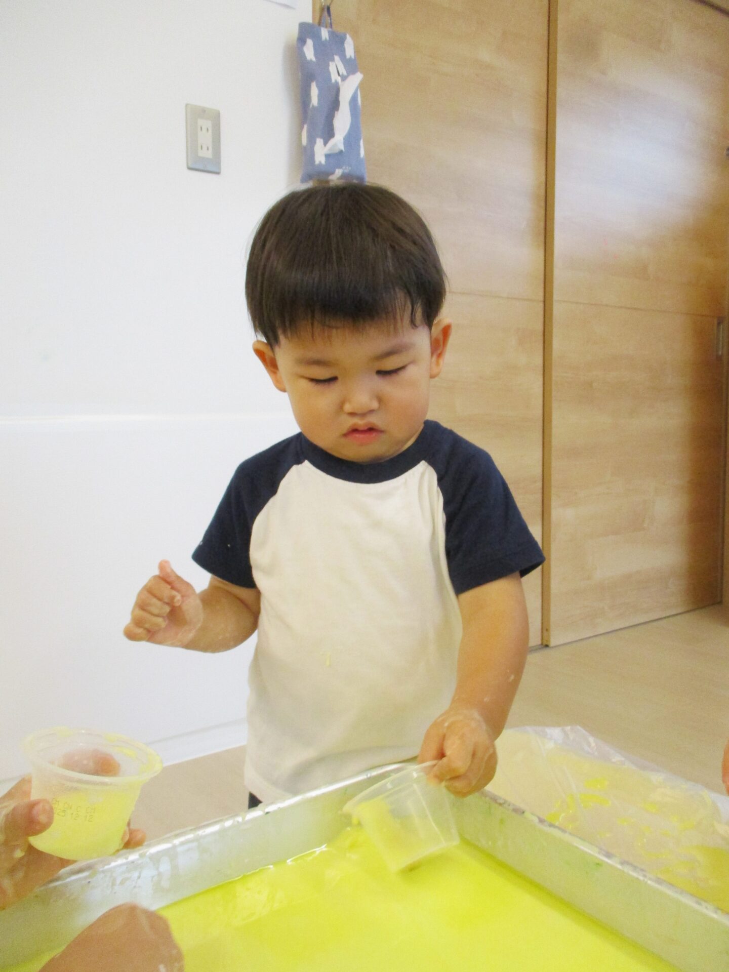 カップも準備し、手で直接触れる以外の遊びも楽しめるようにします。