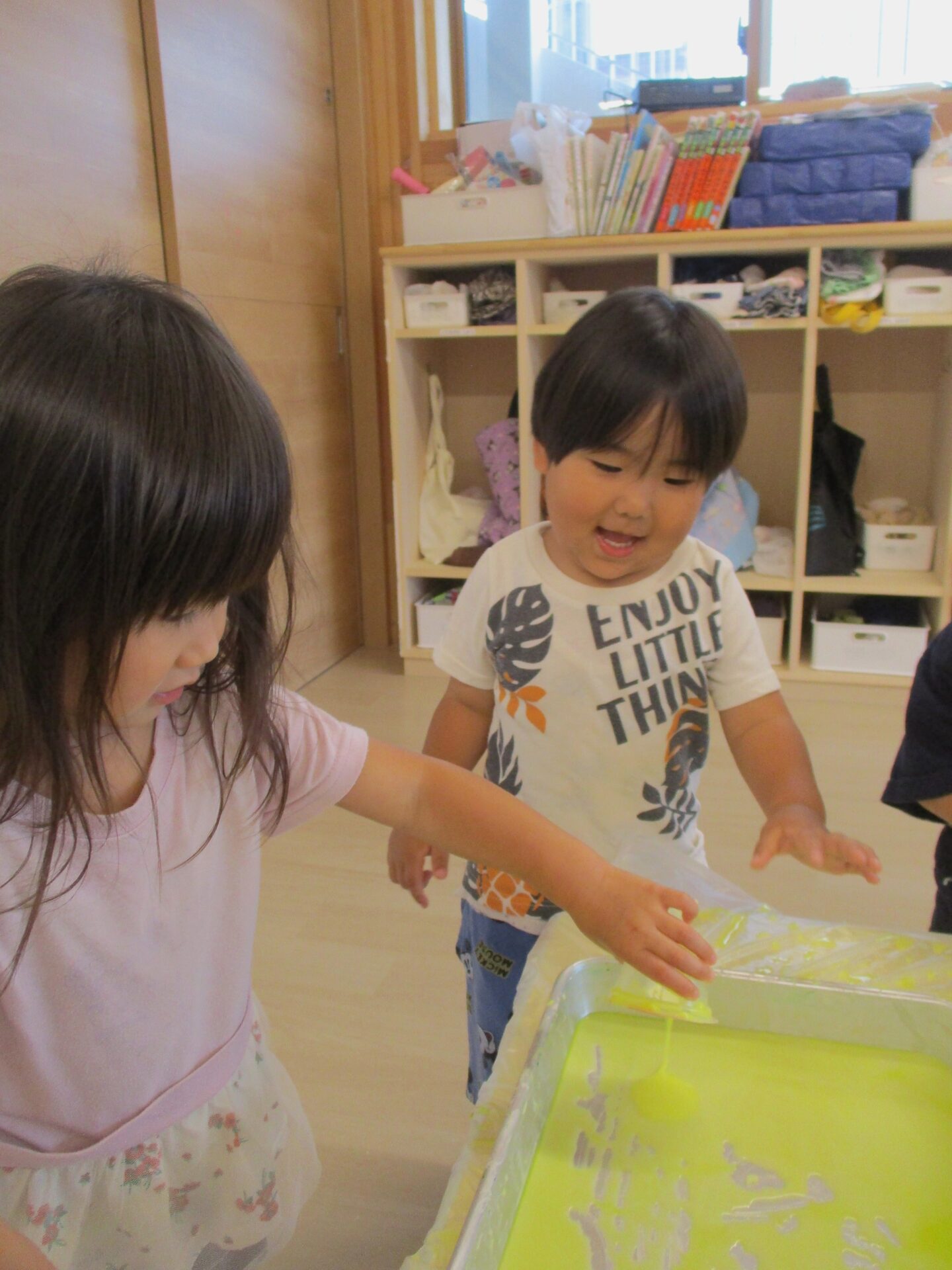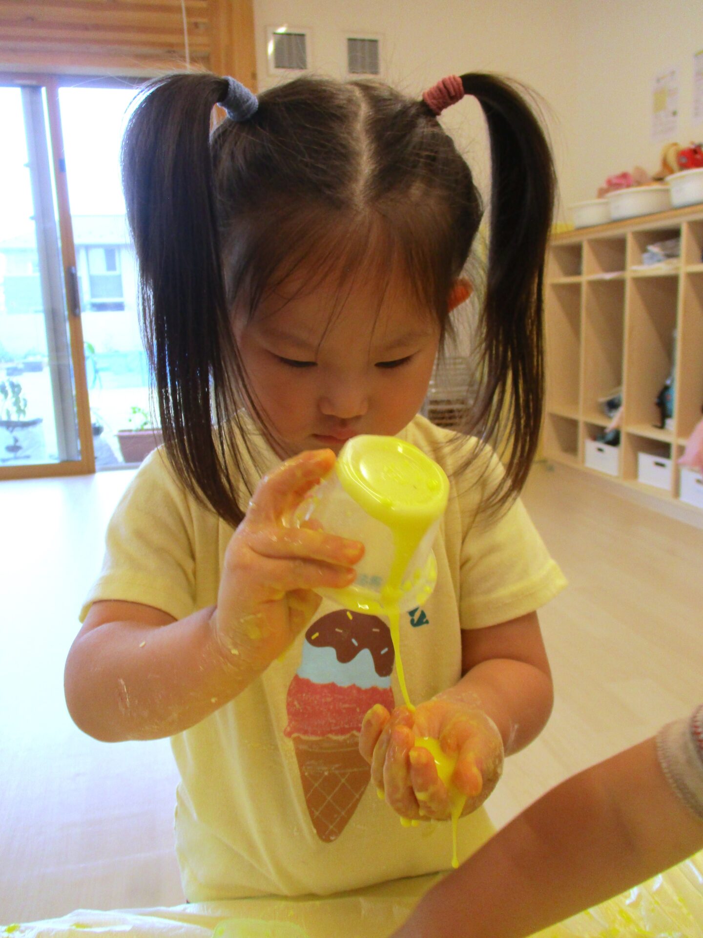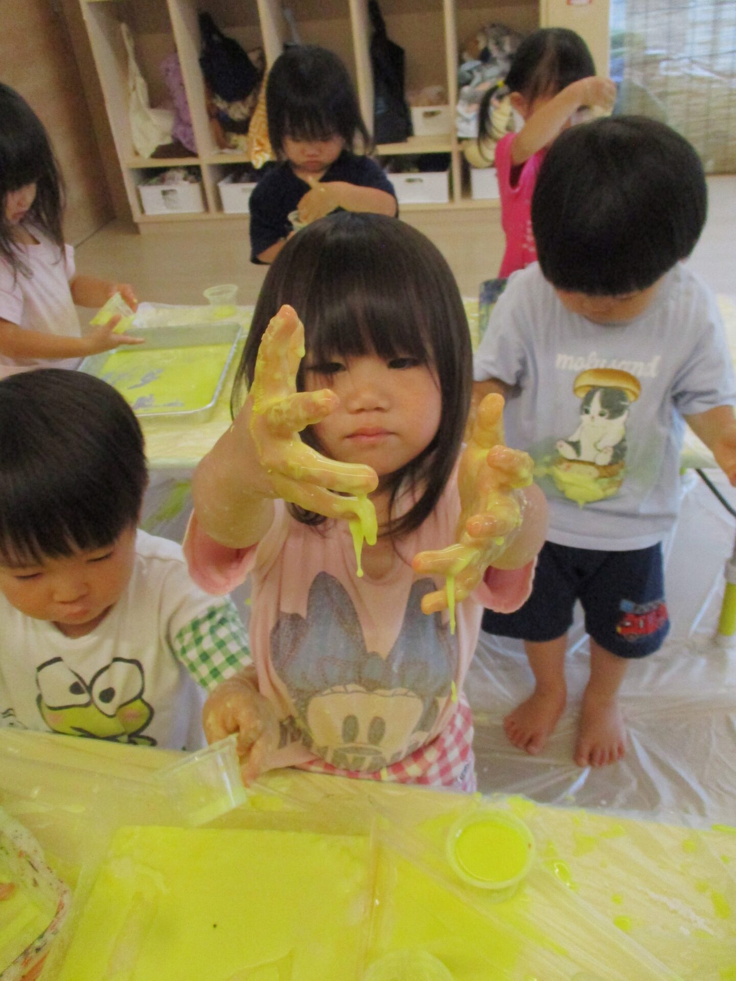 片栗粉ならではの感触に夢中になって楽しんだあめ組のこどもたち。
