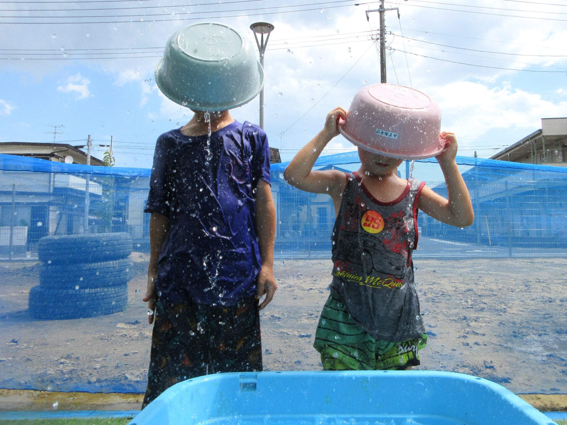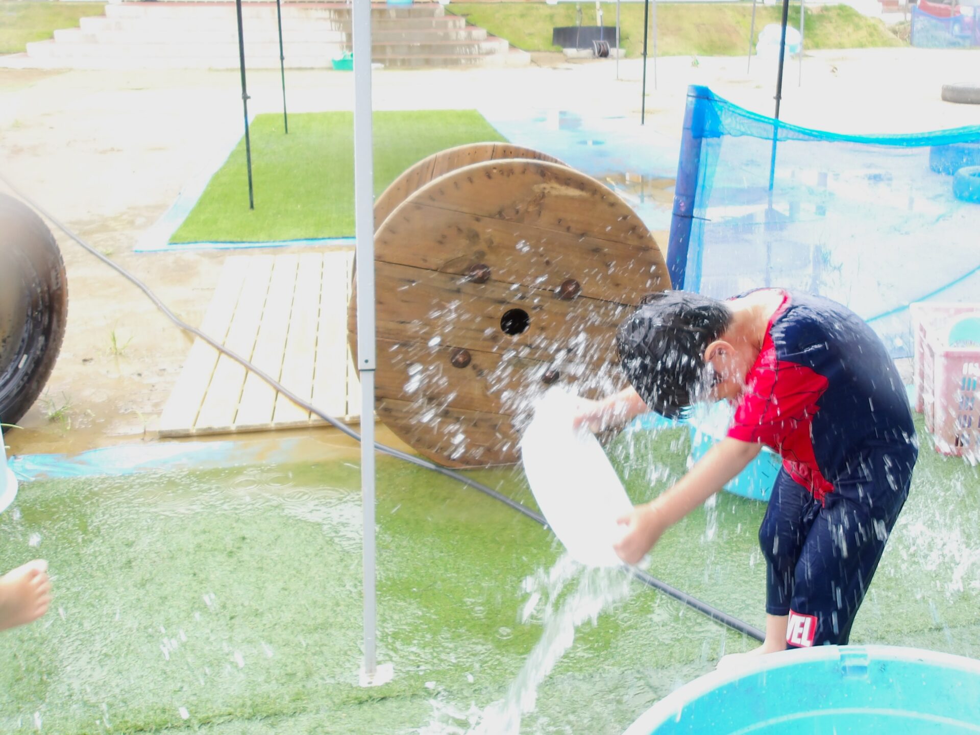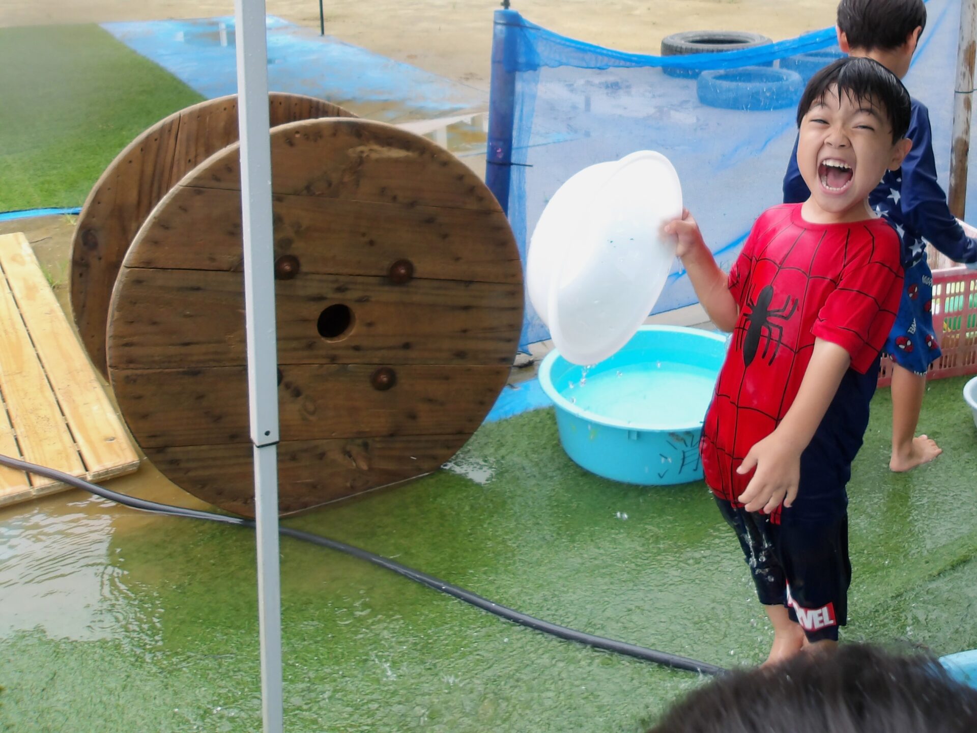 全力水遊びでは水の掛け合いが苦手な子もいるので、静かに遊びたいグループと水を掛け合うグループの2グループに分かれて行っています。
