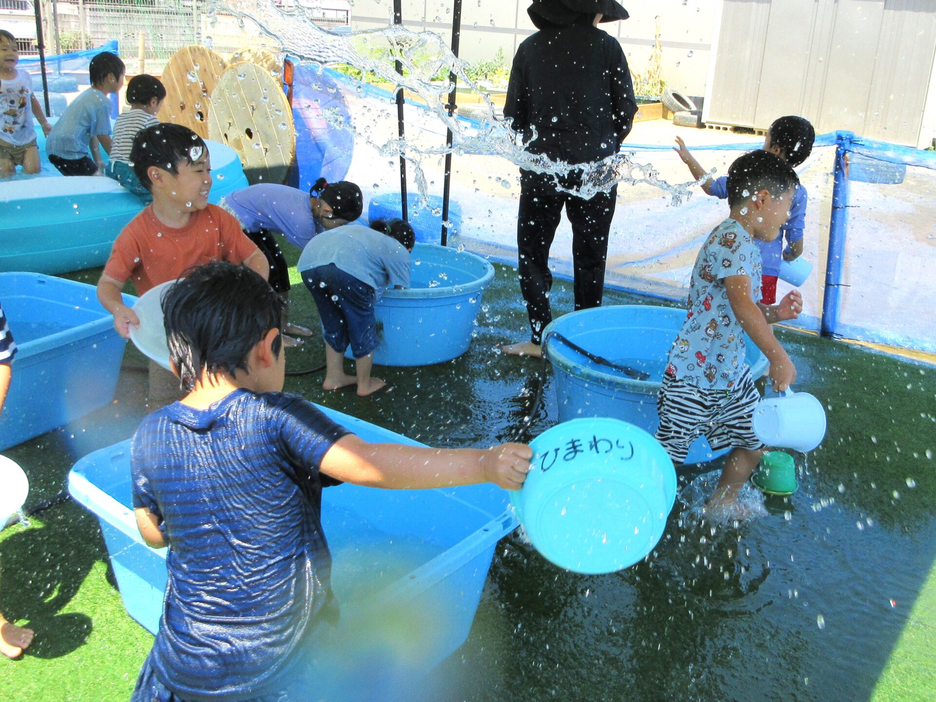 夏真っ盛りの今、そら組(4歳児)とくじら組(5歳児)のこどもたちは「全力水遊び」で盛り上がっています!
