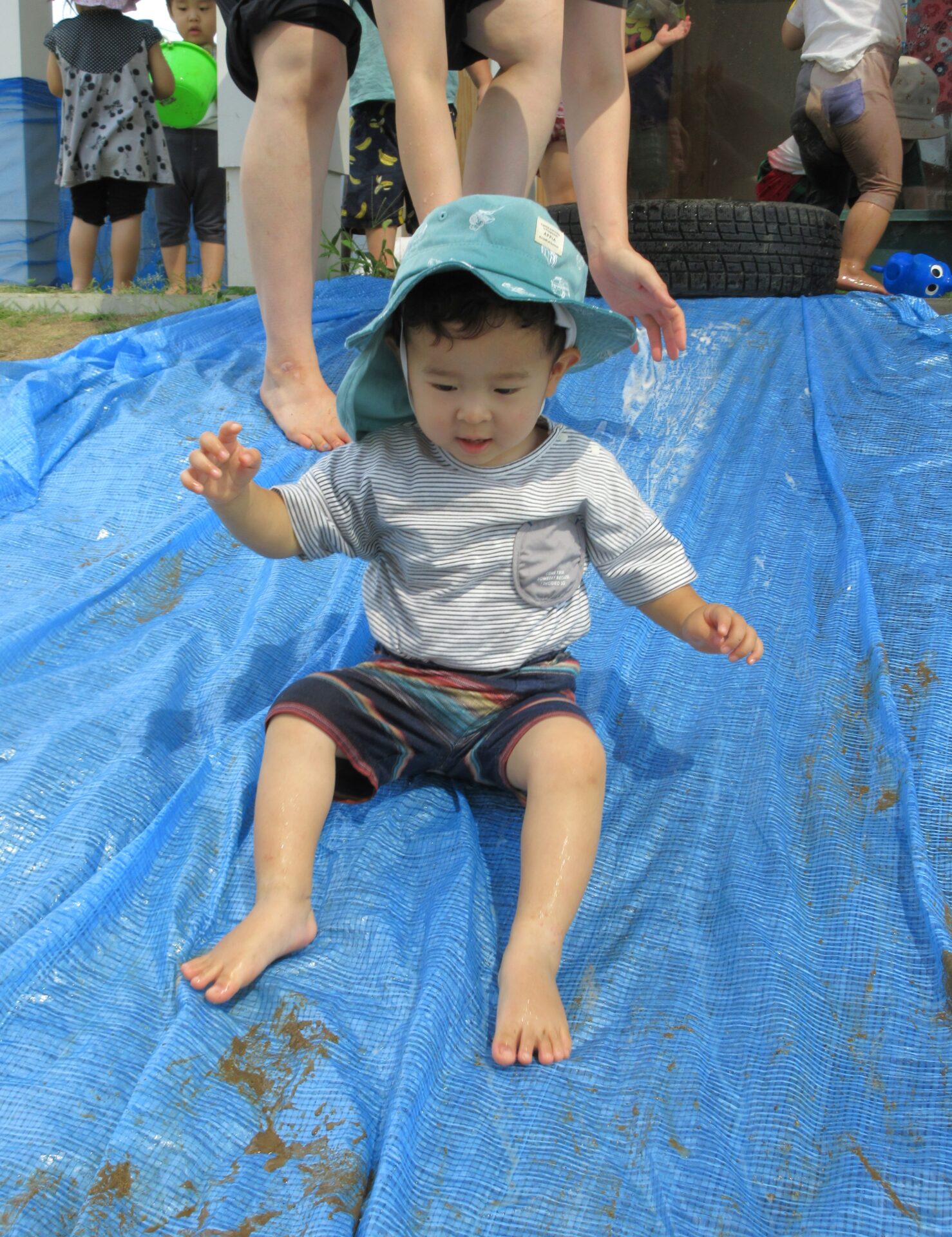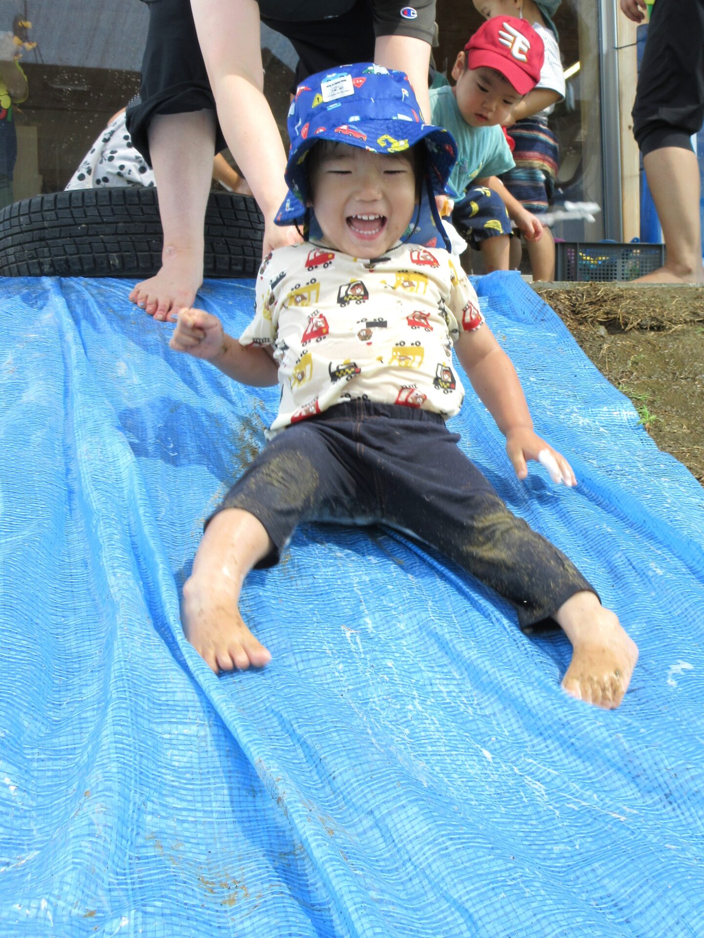 水遊びを楽しみながら、園舎周りの法面を滑ることも楽しんでいるこどもたちの姿を見て保育者が閃きました!