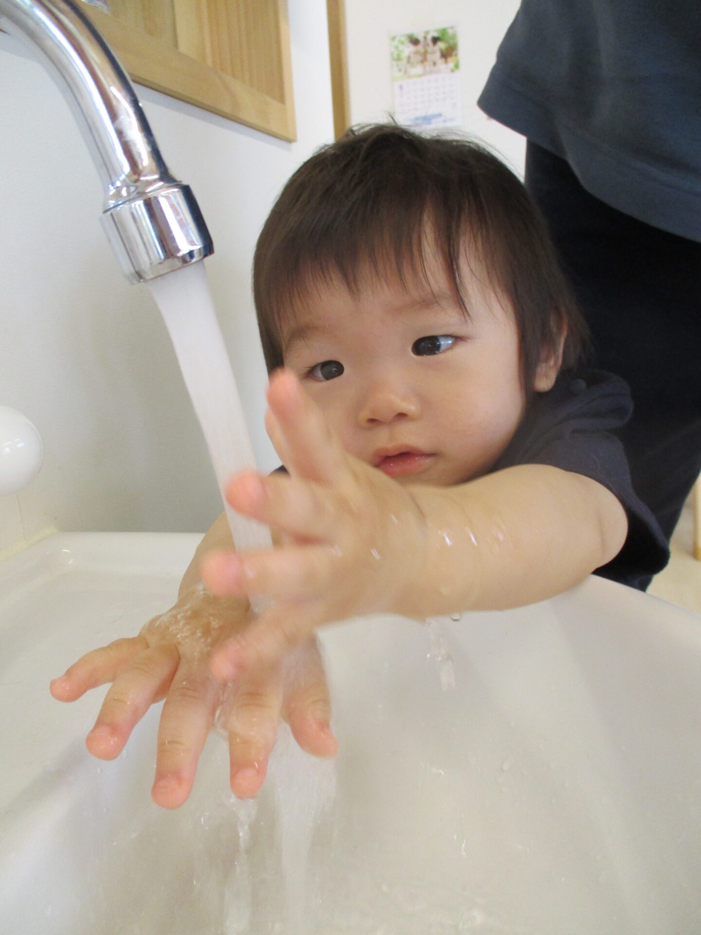 戸外遊びから入室した時はもちろんですが、食事の前は全年齢で必ず行っています。