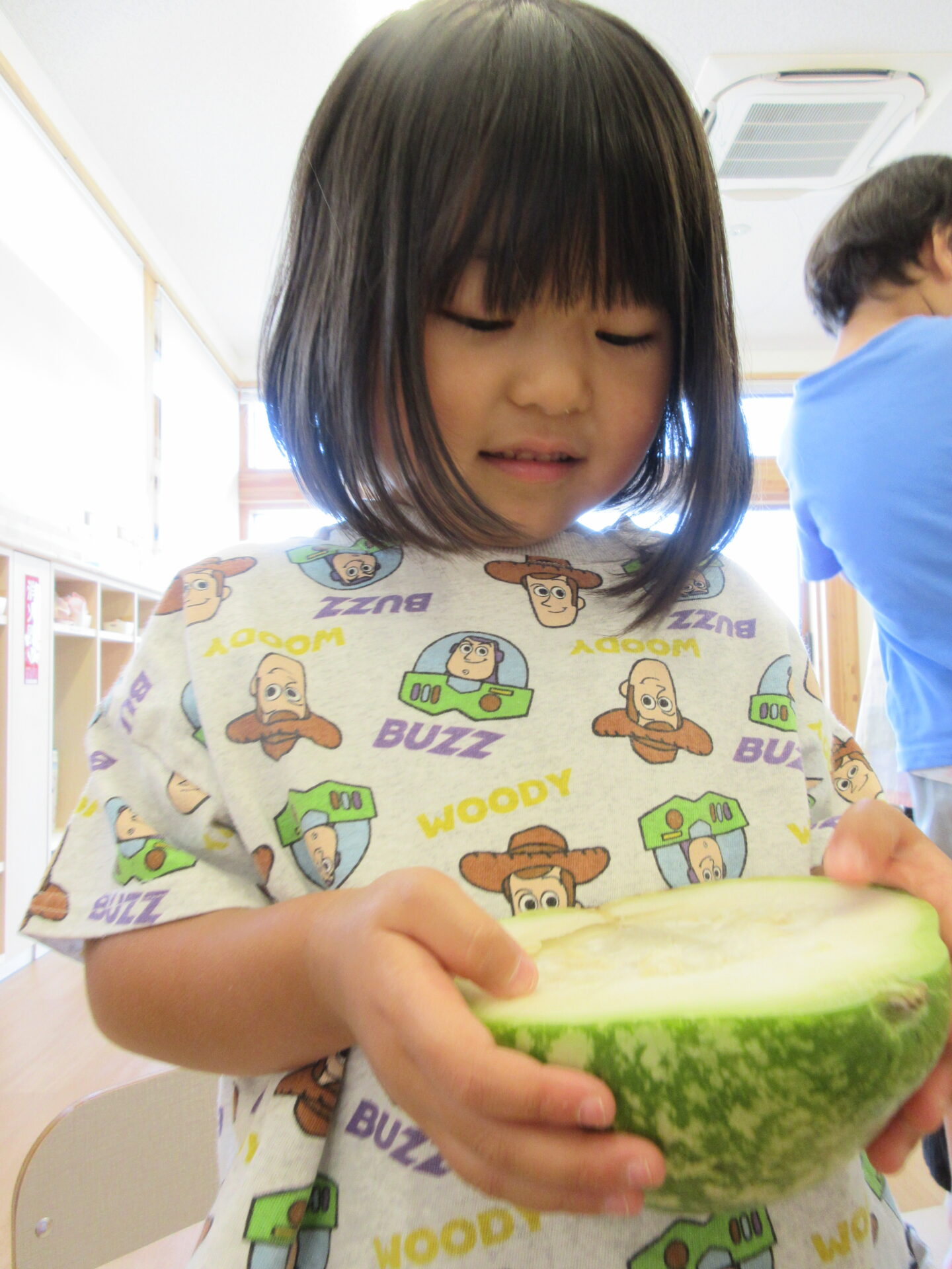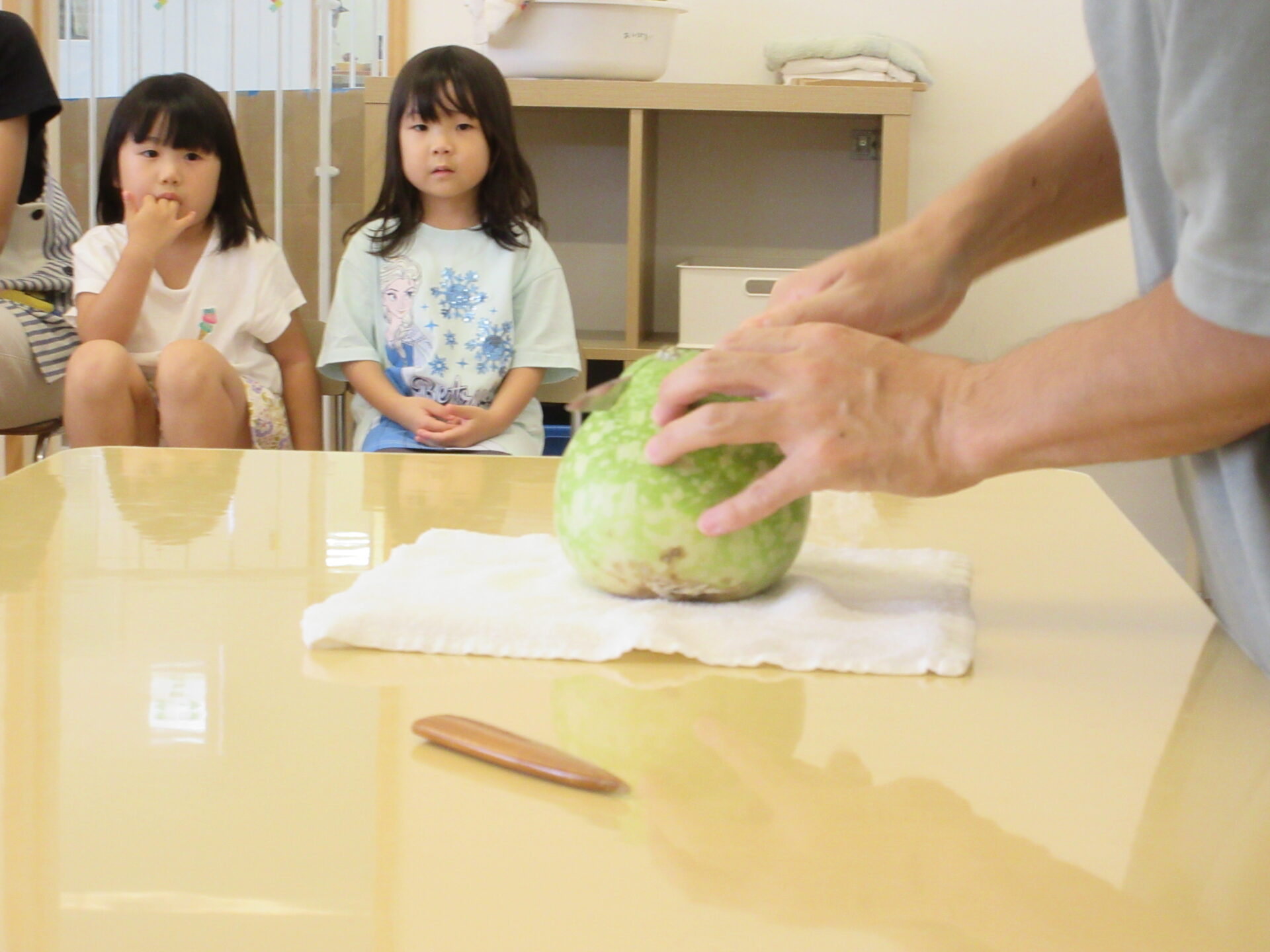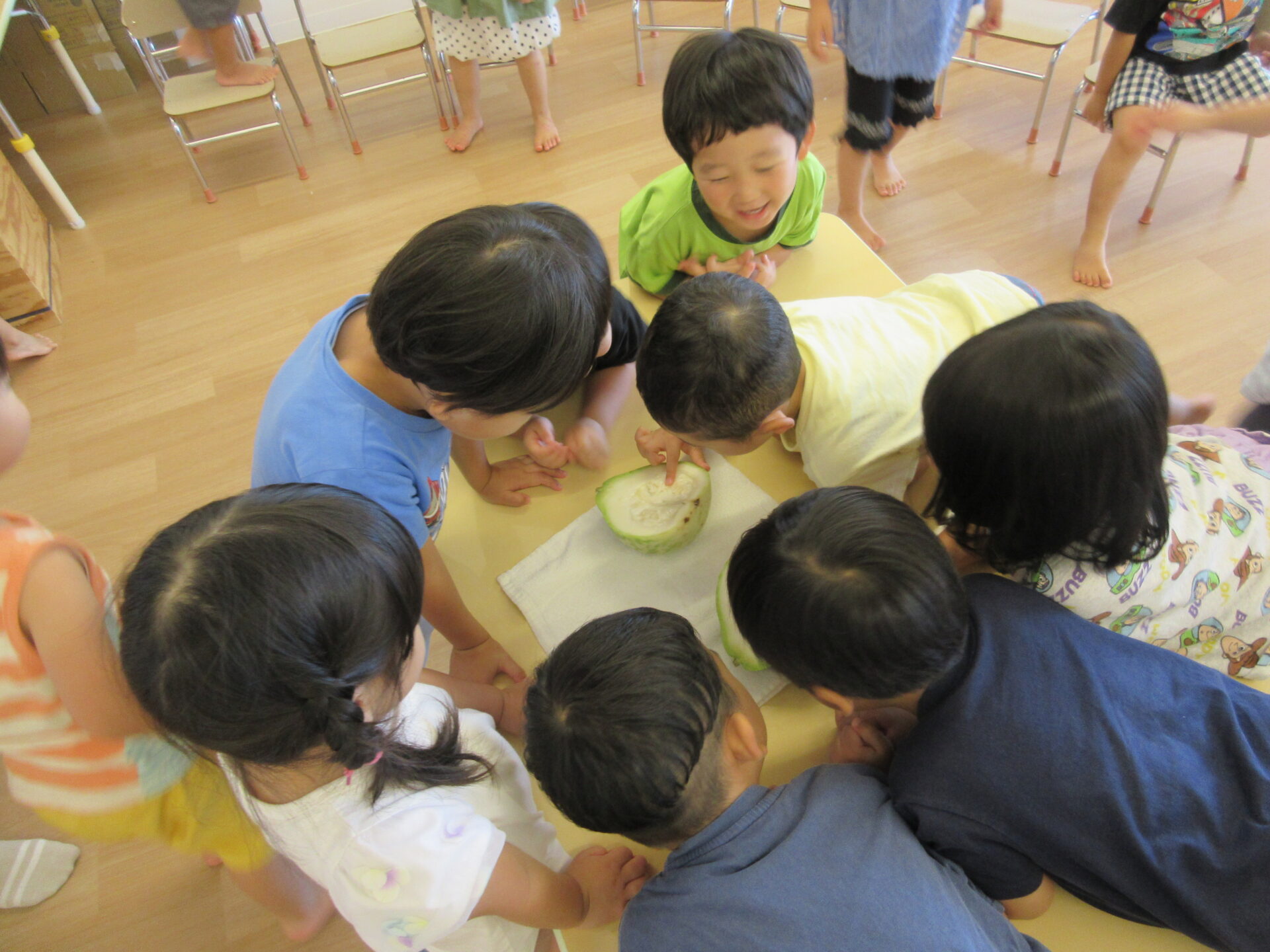くじら組(5歳児)のスイカ畑で育った『謎の野菜』のおすそわけをもらったにじ組(3歳児)。