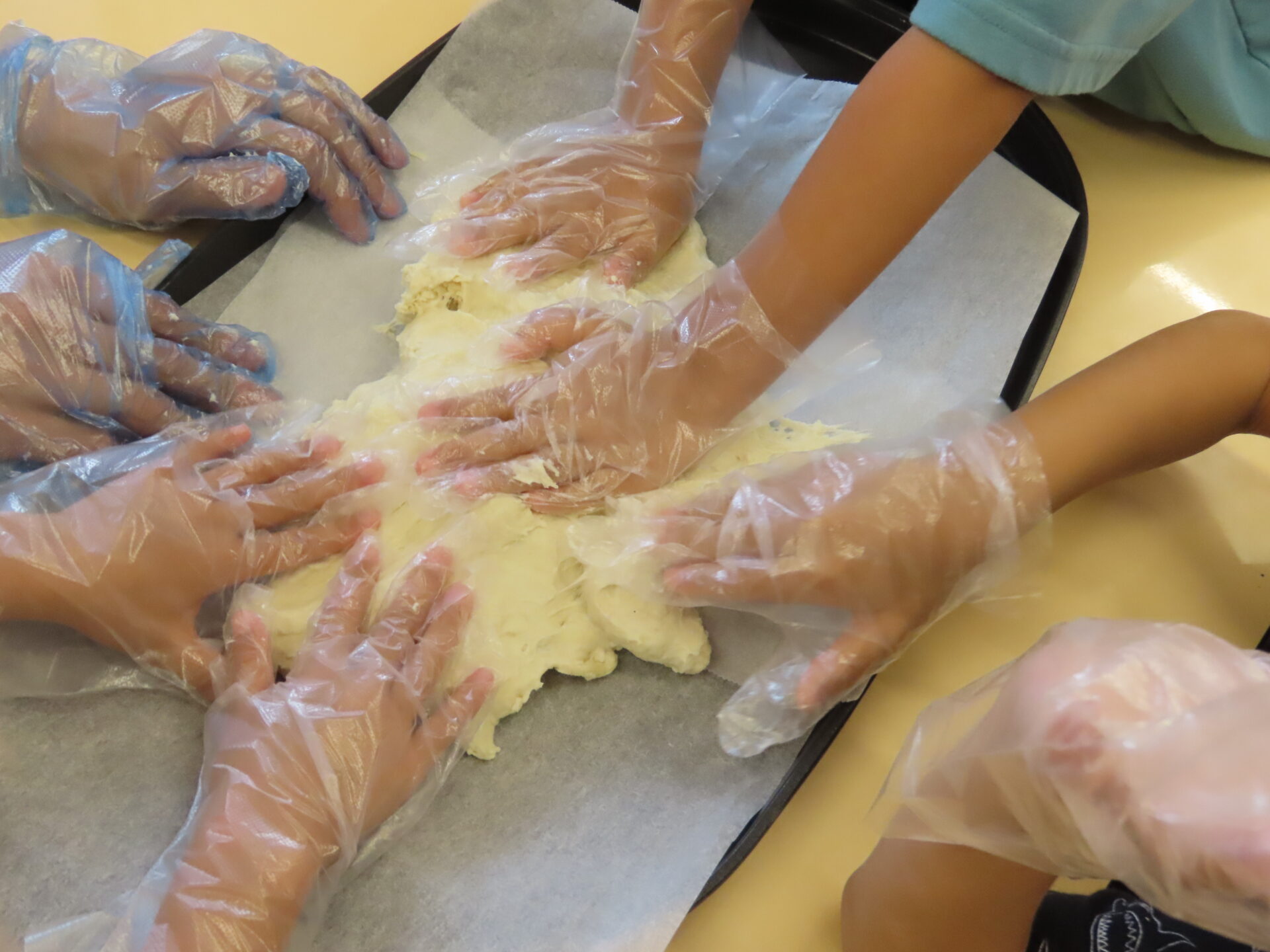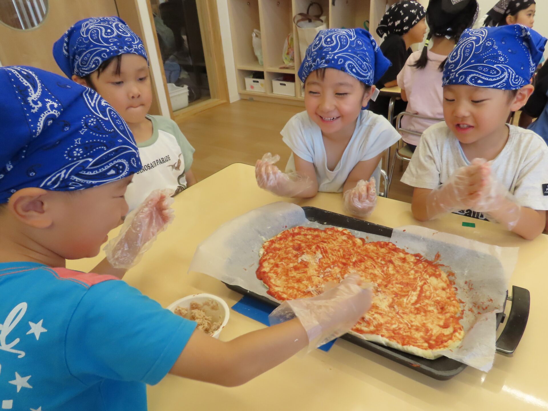 前回、ピザを作った時は一人ずつ作りましたが、今回は『大きいピザを作りたい』と、グループ毎に作ることにしました。