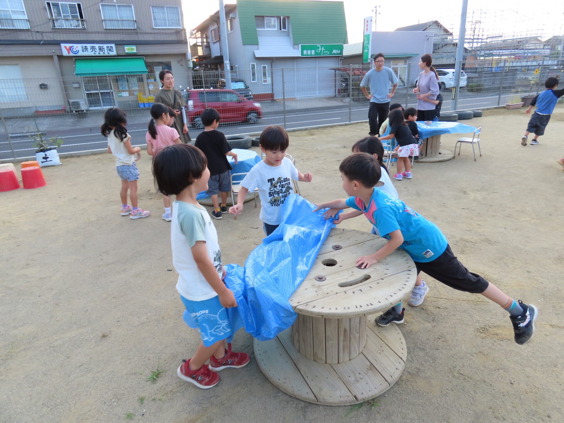 「外のコイルをテーブルとして使うためにはどうしたらいいか」を考え、ブルーシートを敷くこと、風で飛ばないようにテープで止めることにしました。