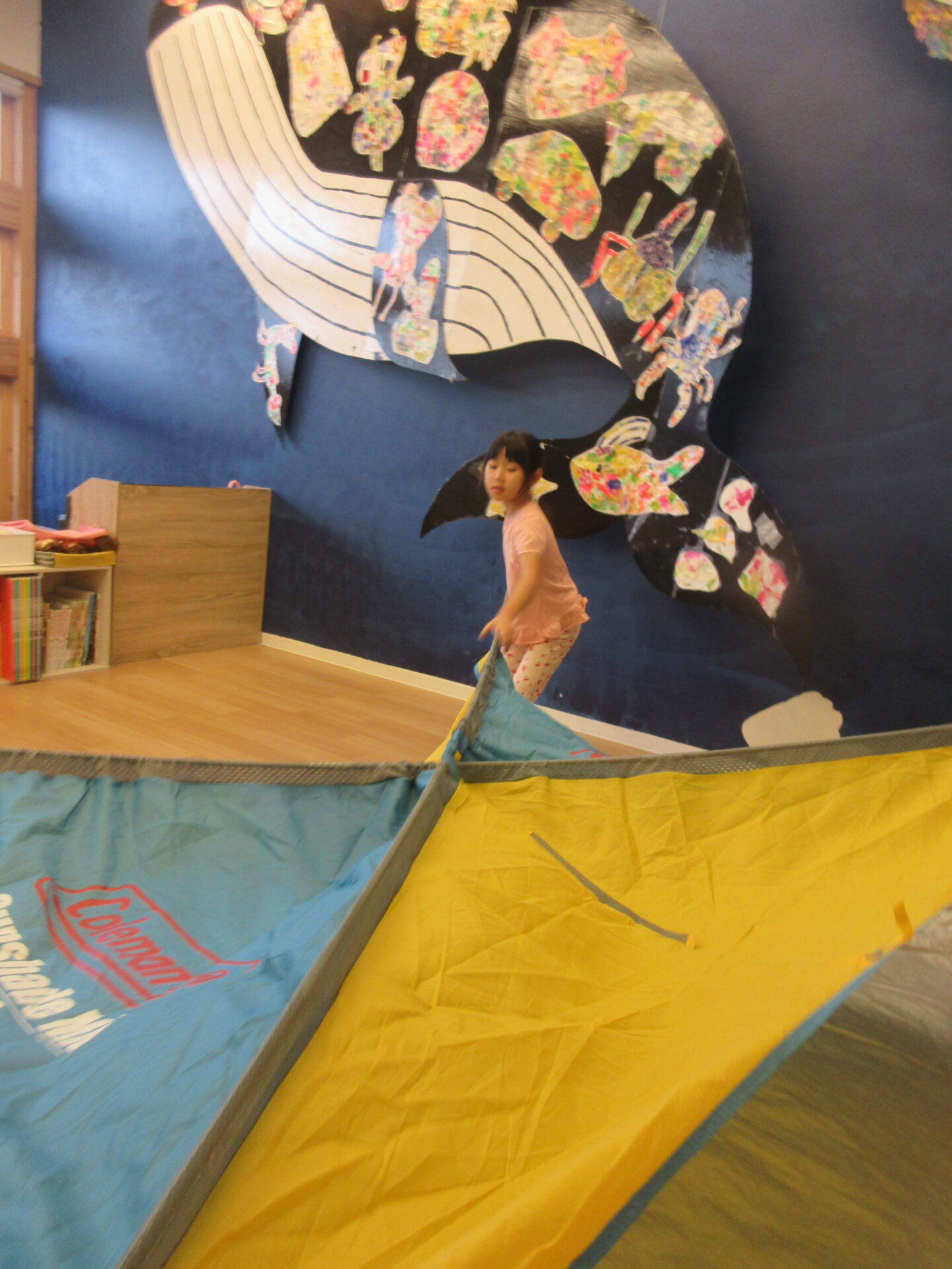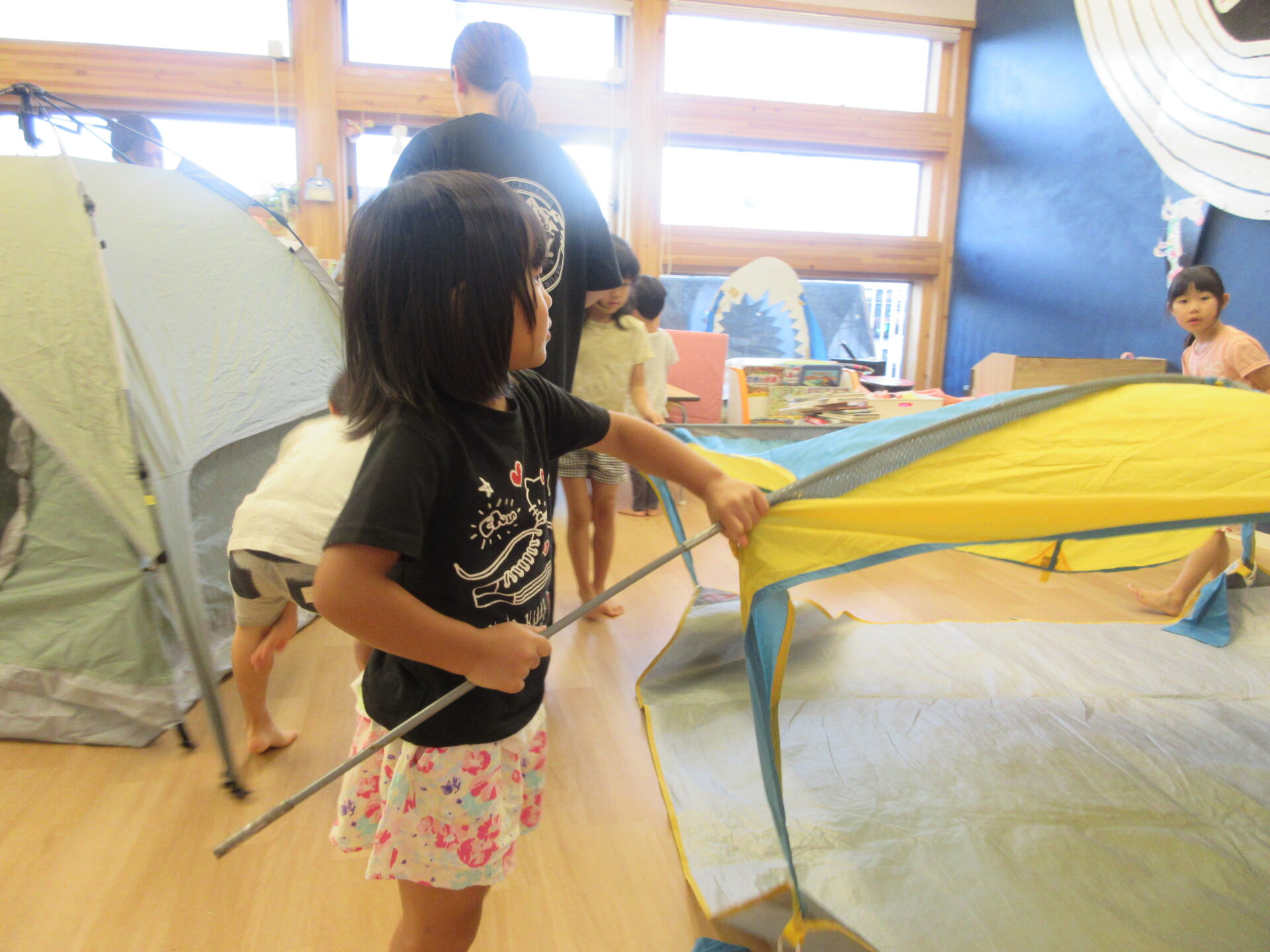 お昼寝の時から使っていたテントの設営はお手の物です。