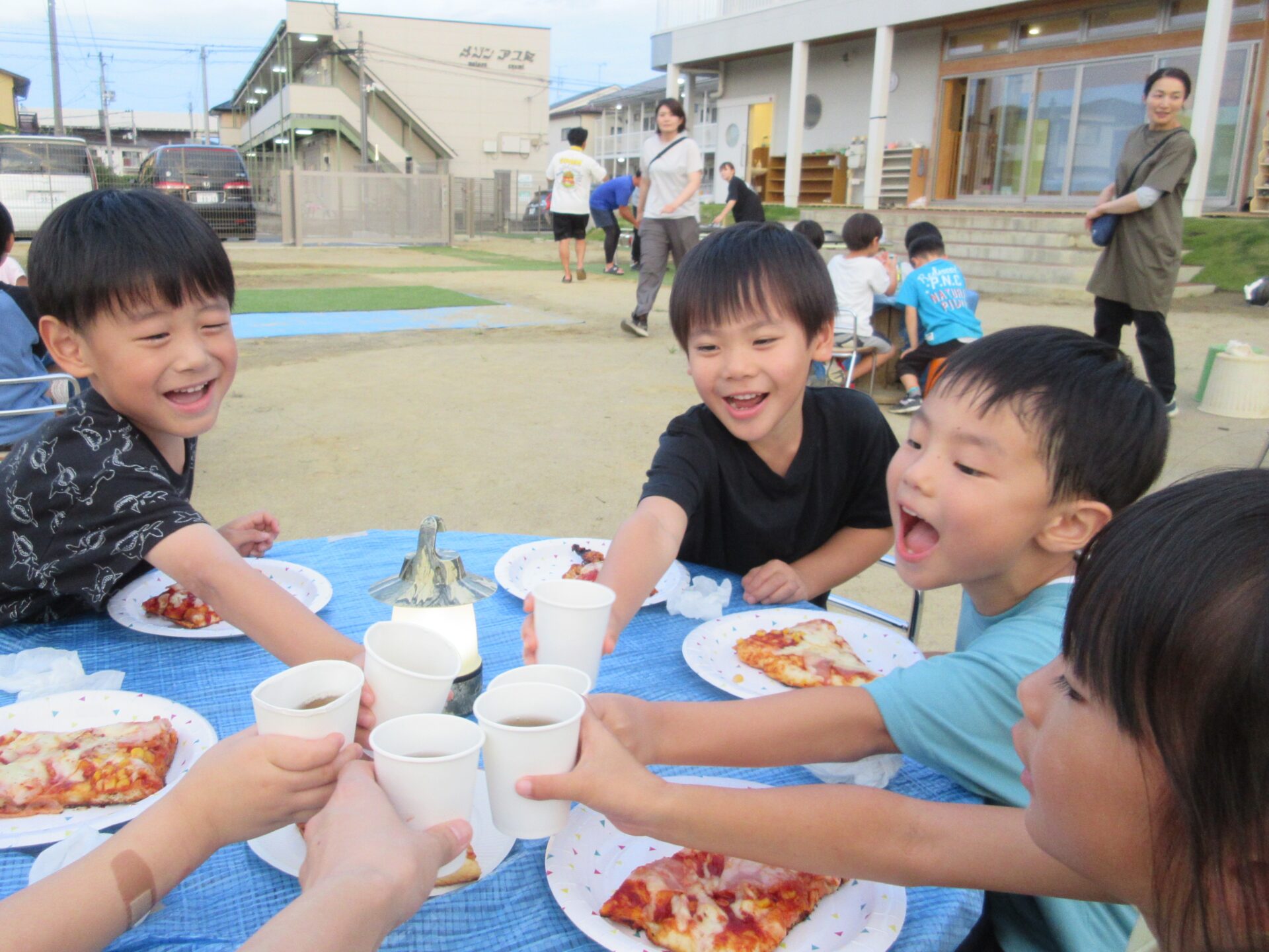 グループ毎に乾杯し、楽しいピザパーティーの始まりです。