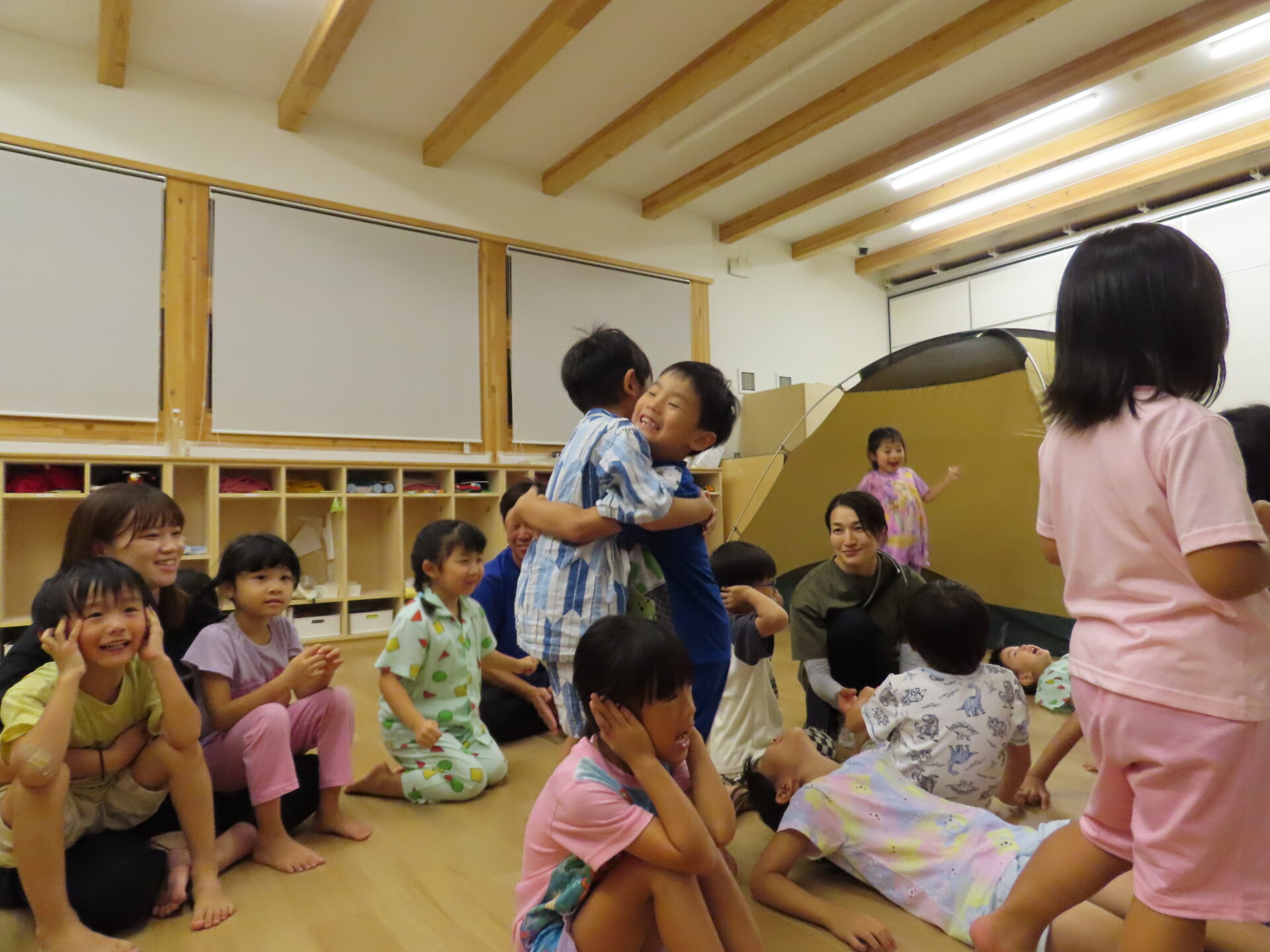 初めてのお泊り保育で、こどもたちの「やりたいこと」盛りだくさんを実現するため、姉妹園のバオバブ保育園より園長や男性保育士らが応援に駆けつけてくれました。
