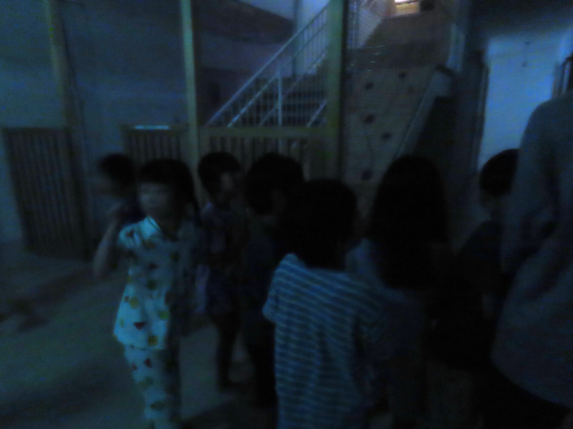 グループ毎に分かれて、まっくらやみの保育園を探検します。