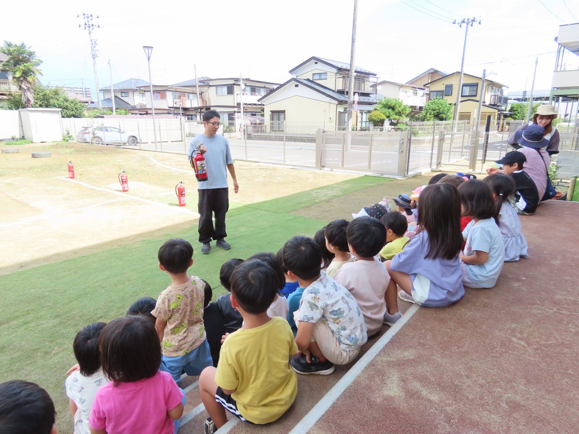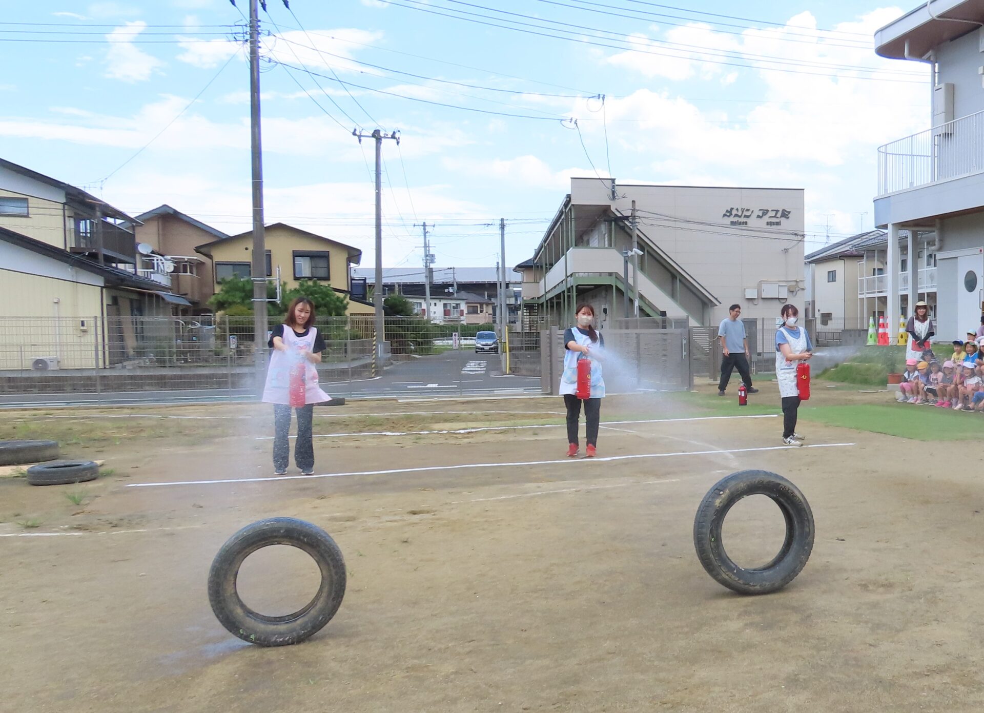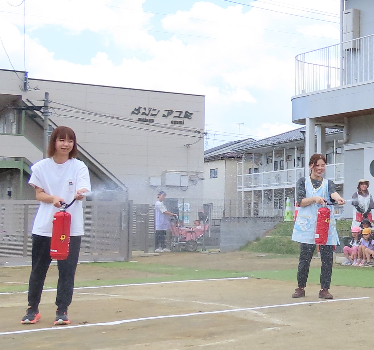 火災を想定した避難訓練の後、3・4・5歳児のこどもたちの前で「水消火器」を使って消火訓練を行いました。