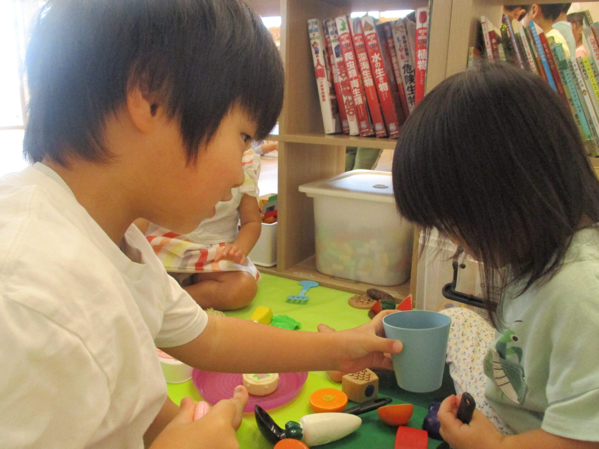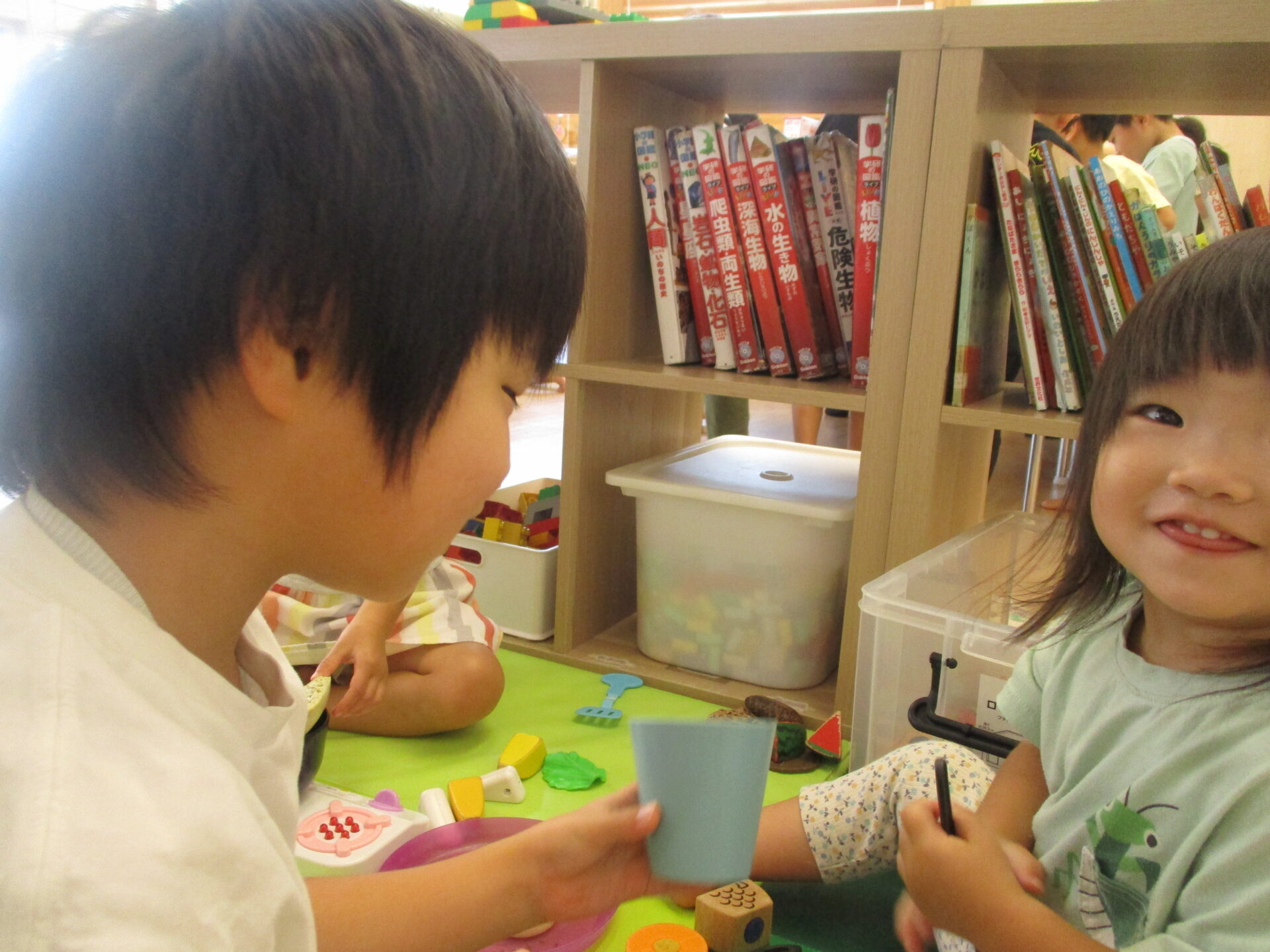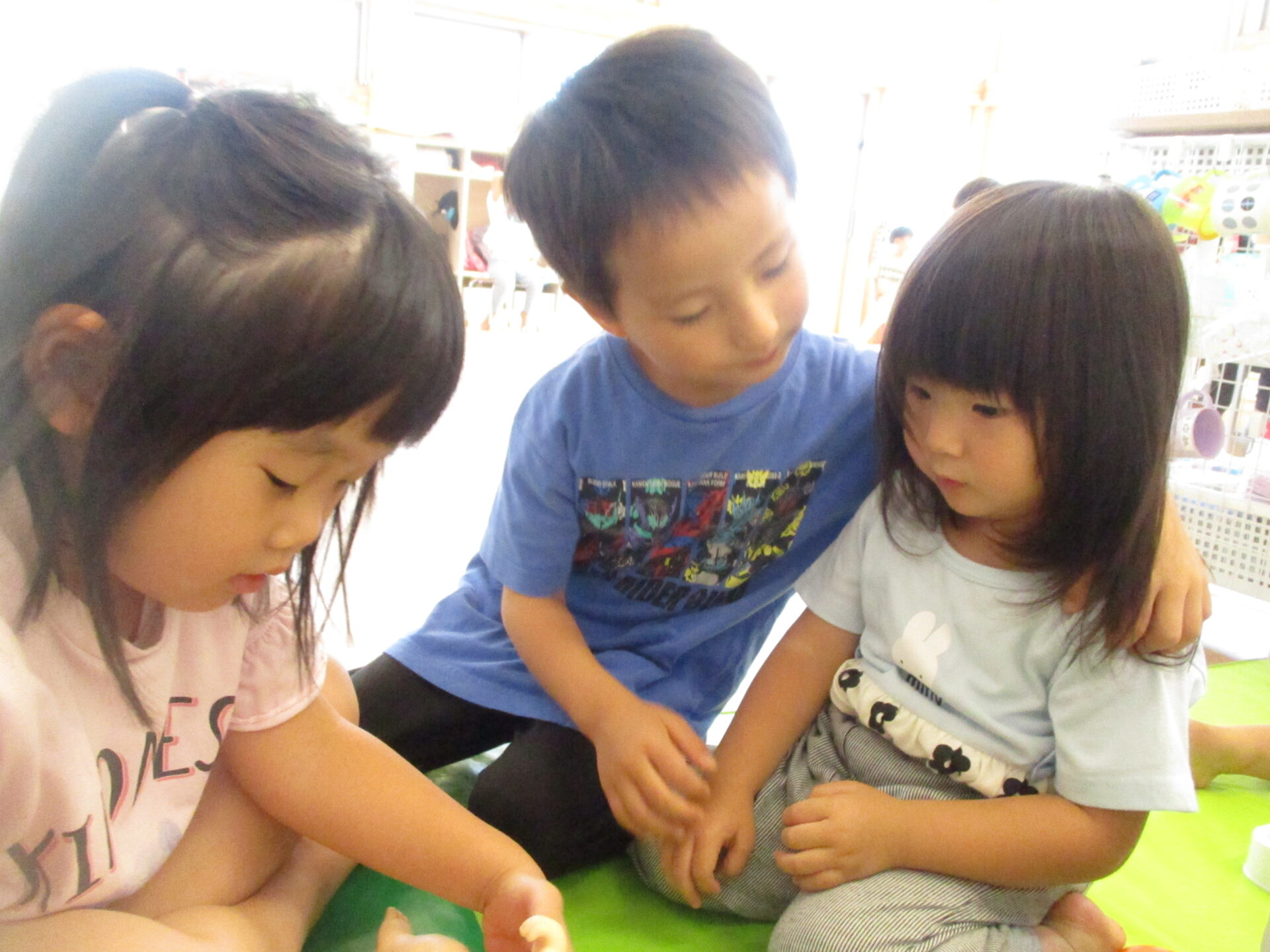 そら組の玩具に興味津々なあめ組のこどもたちに、お兄さん、お姉さんたちが優しく使い方を教えてくれたり、一緒に遊んで過ごしました。