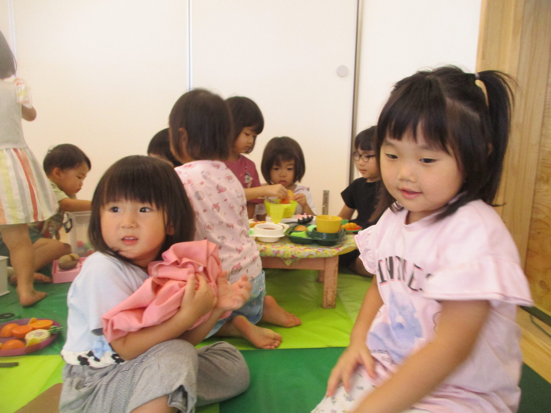 あめ組(2歳児)のこどもたちが、そら組(4歳児)のお部屋に遊びに行きました。