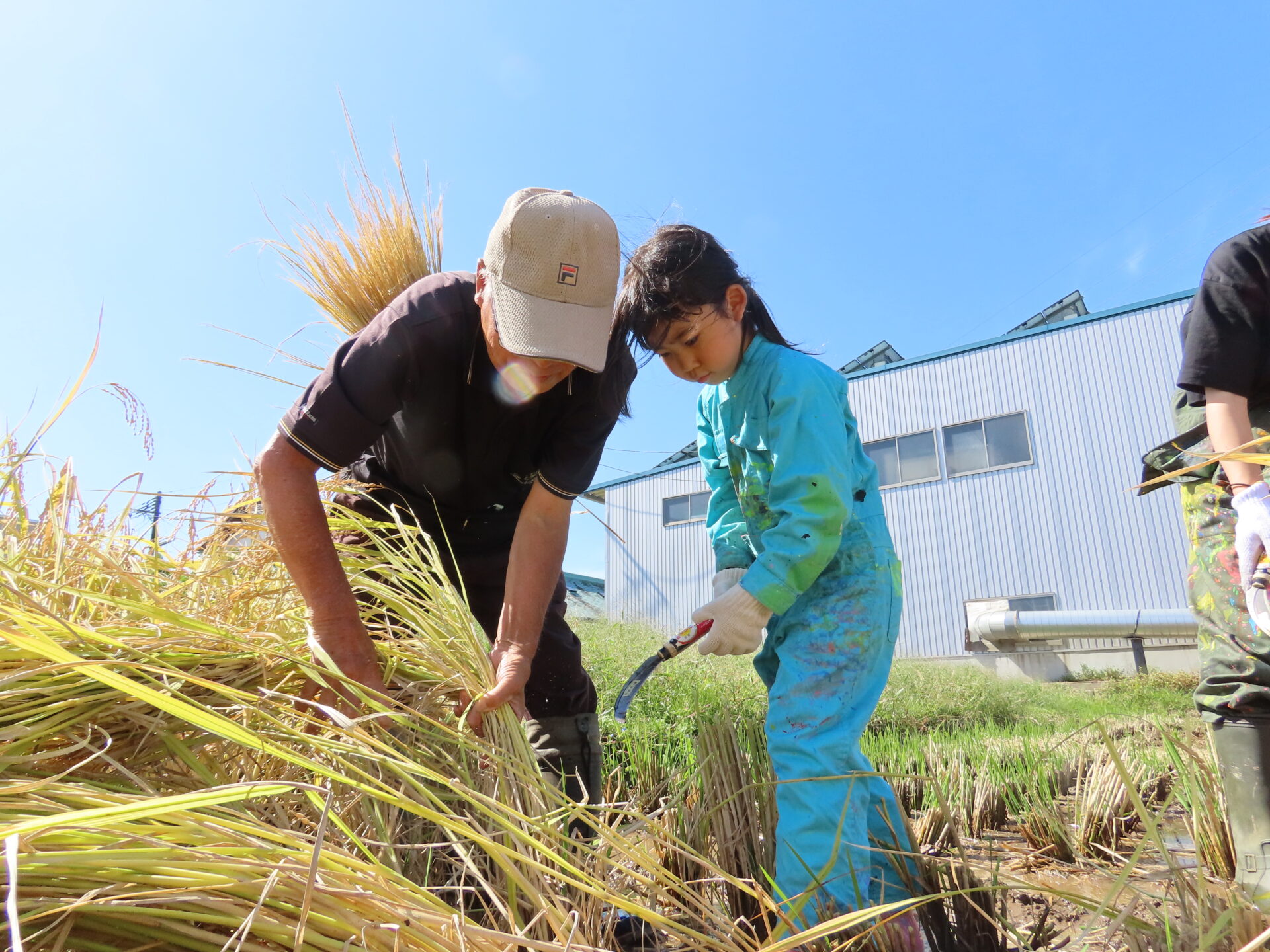 真剣な表情で、しっかり稲を掴んで、鎌で刈り取ります。
