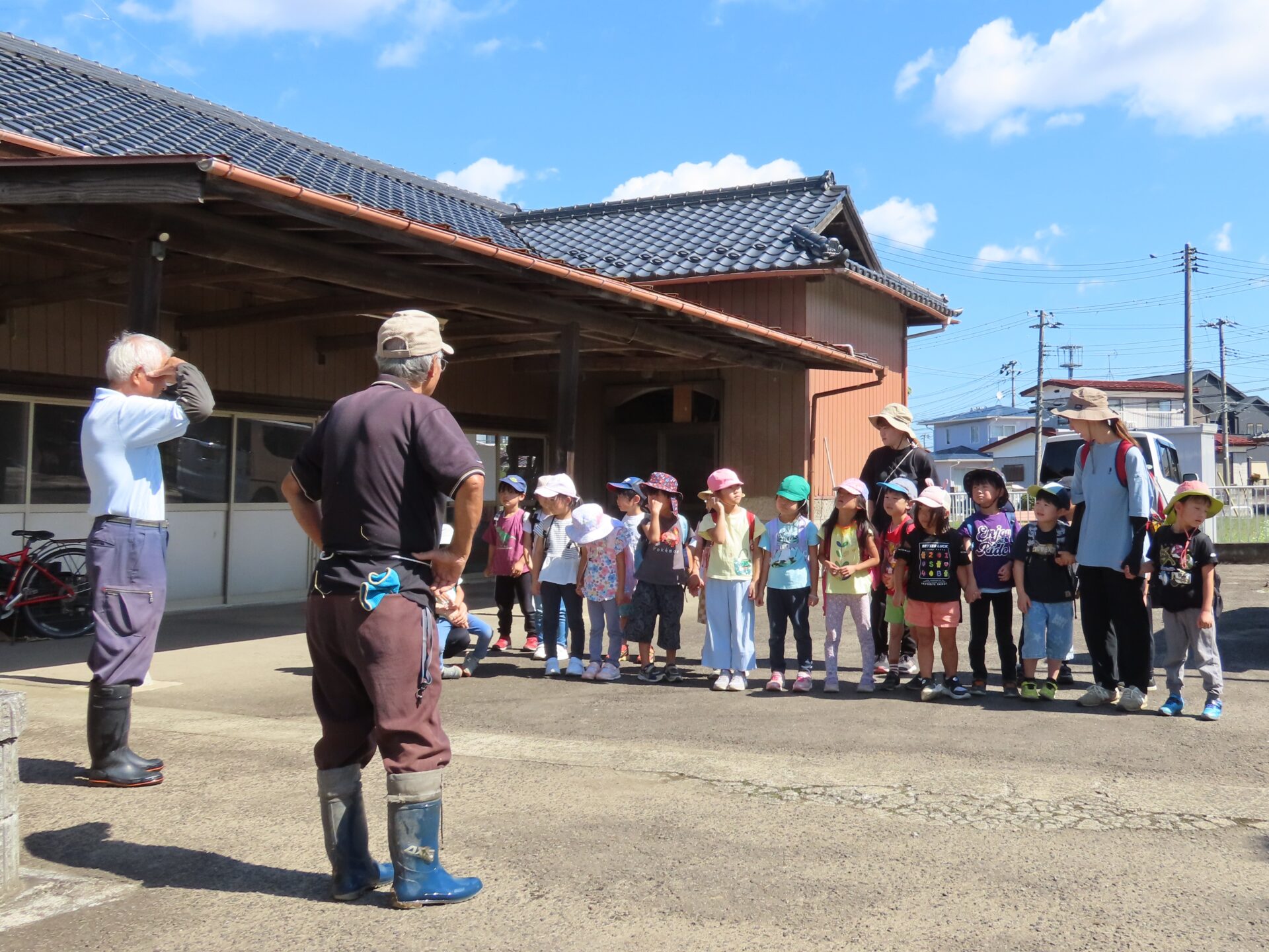 稲刈り後、お手伝いいただいた農家と地域の方にみんなでお礼を言いました。