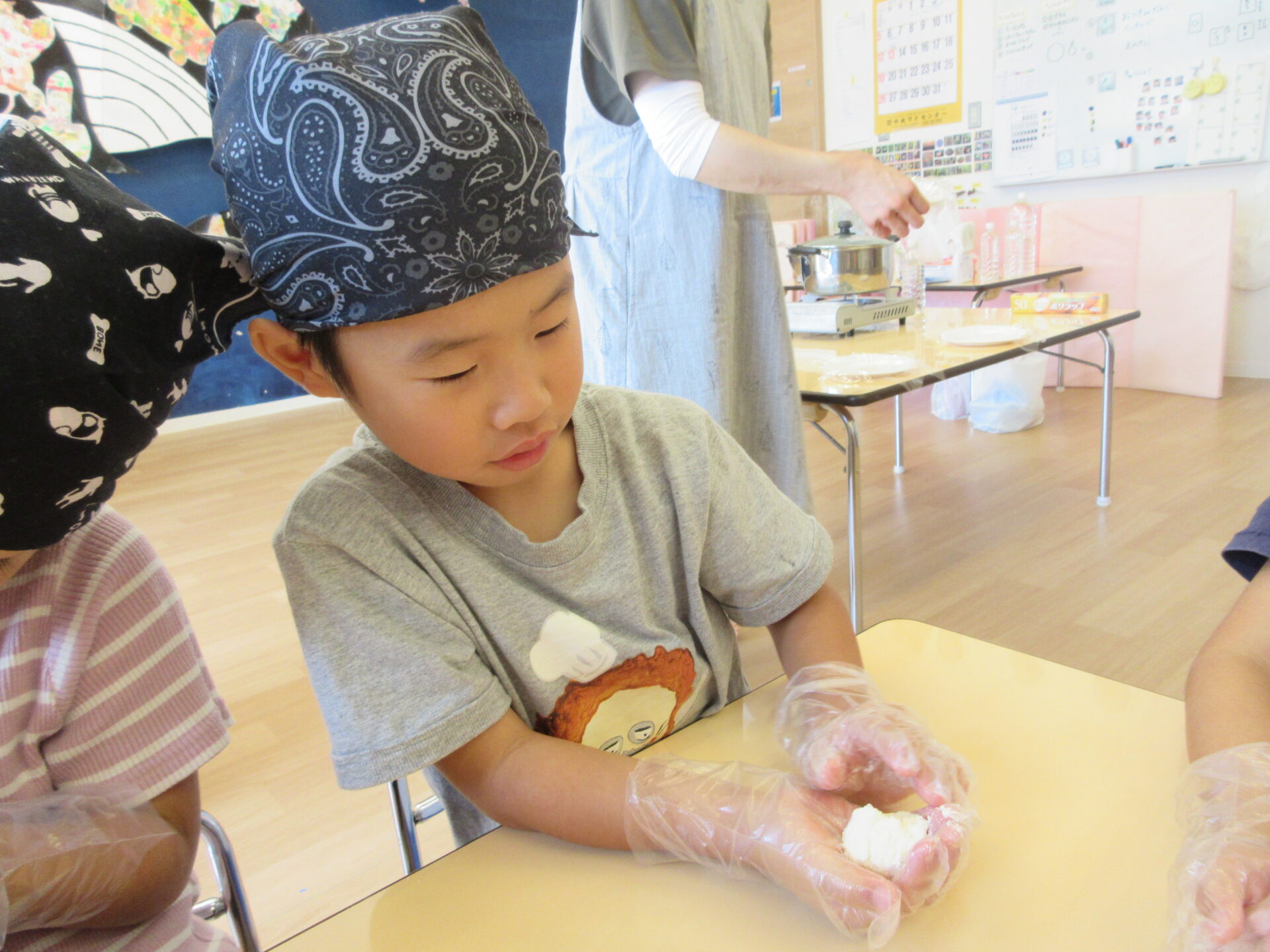 混ぜ方は様々で、グループ全員で混ぜたり、少しずつ丁寧に混ぜたり、体重を乗せて肘で混ぜたりと、思い思いの方法で取り組んでいました。