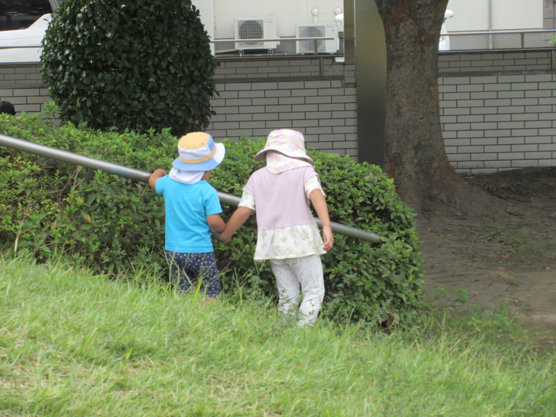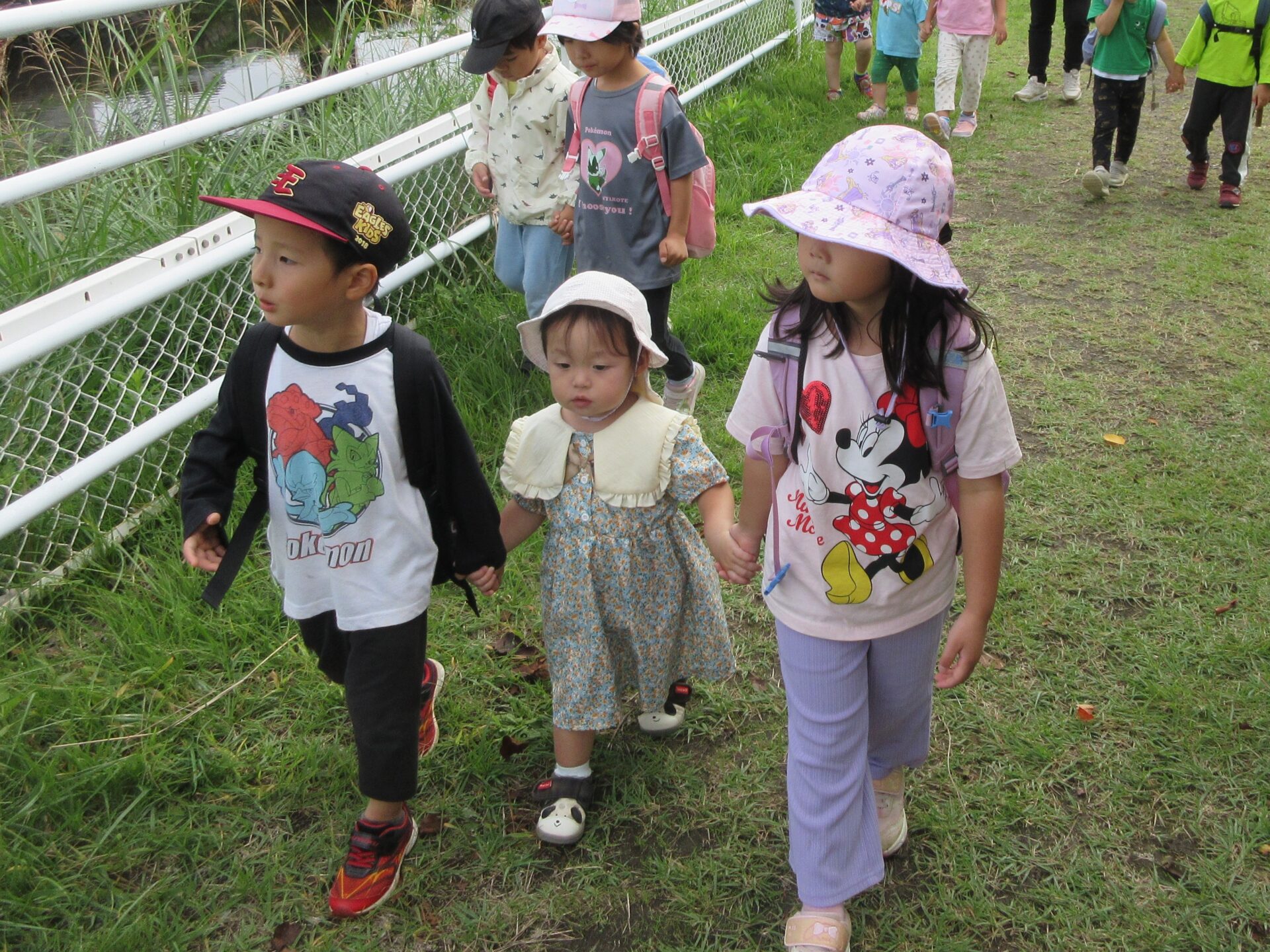 4歳児にとっては歩き慣れた道のりですが、今日は1歳児と一緒です。4歳児は1歳児のこどもたちの顔を見ながら、歩く速さを合わせて歩いていました。