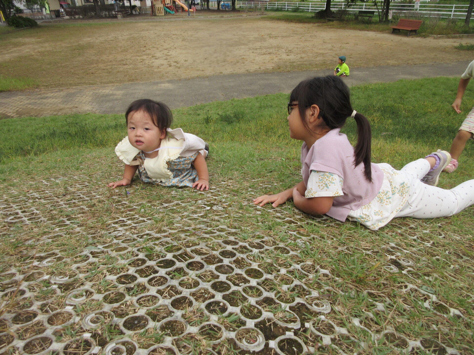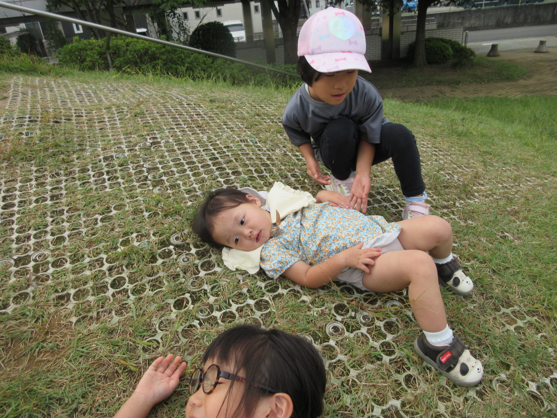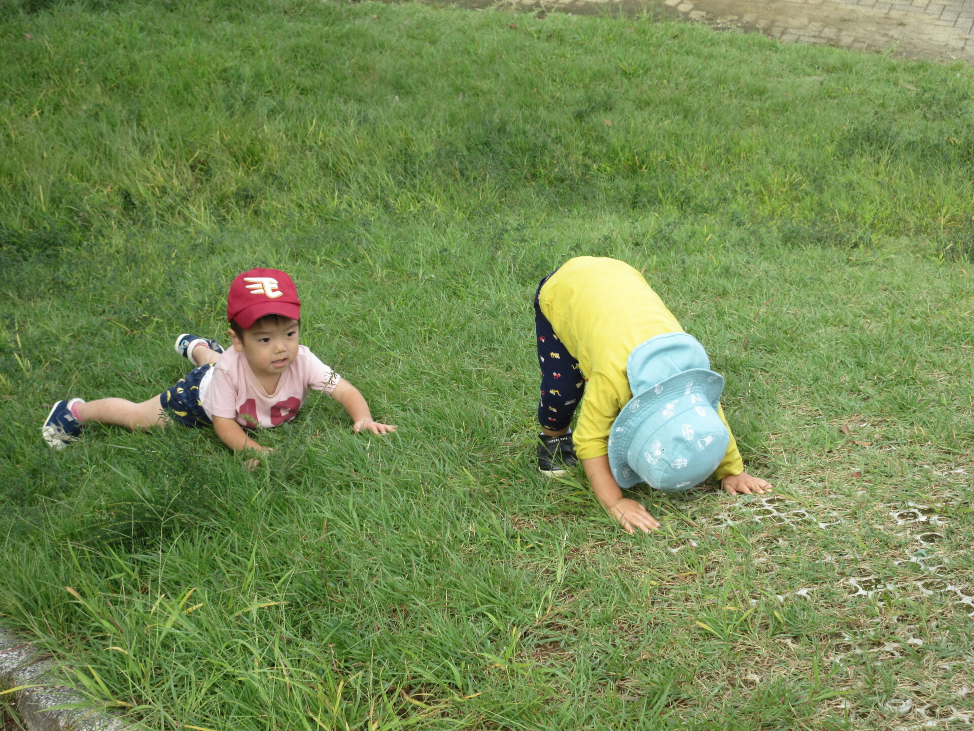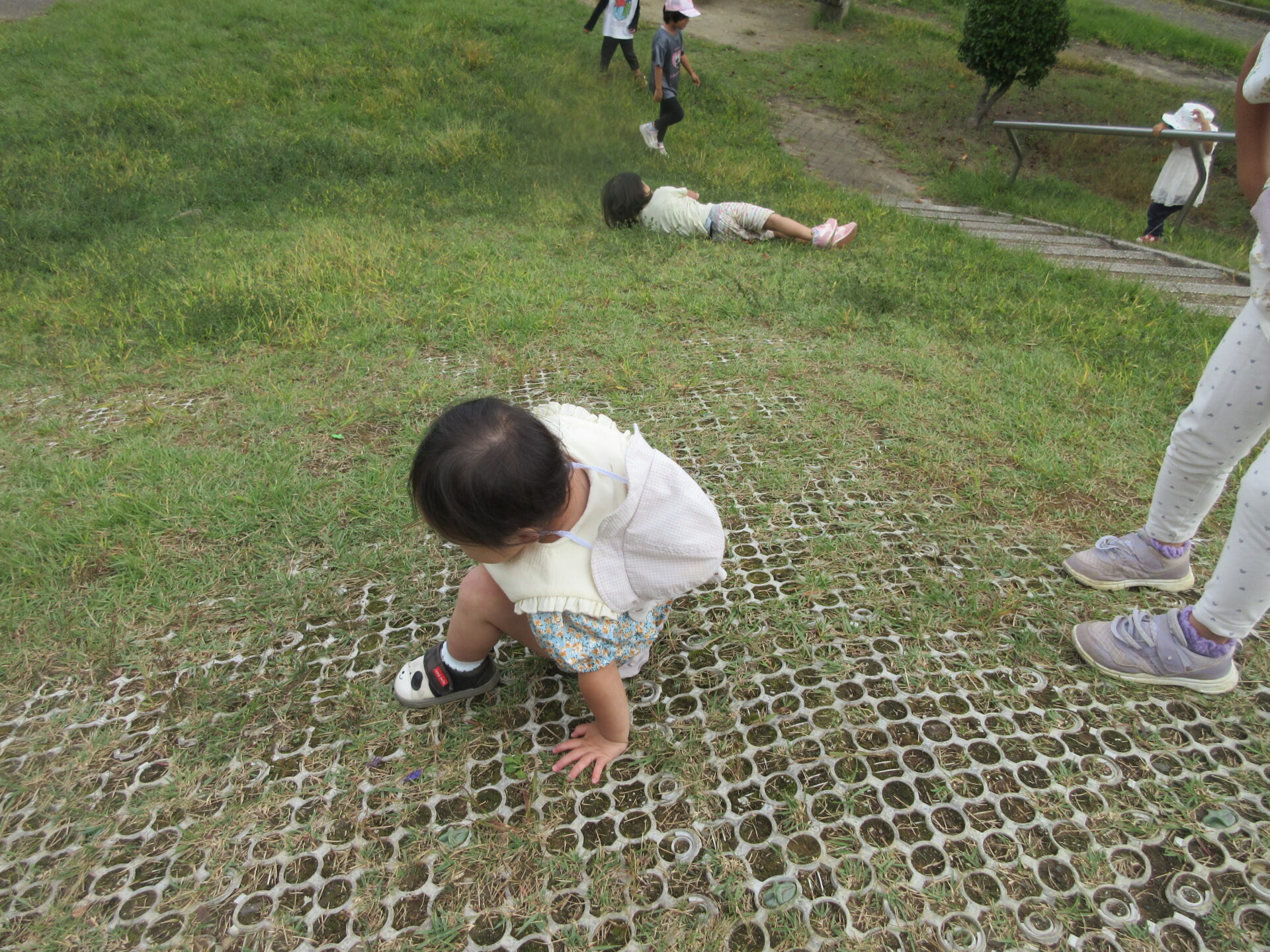 4歳児が、築山転がりを楽しんでいる様子を観察していた1歳児のこどもたち。