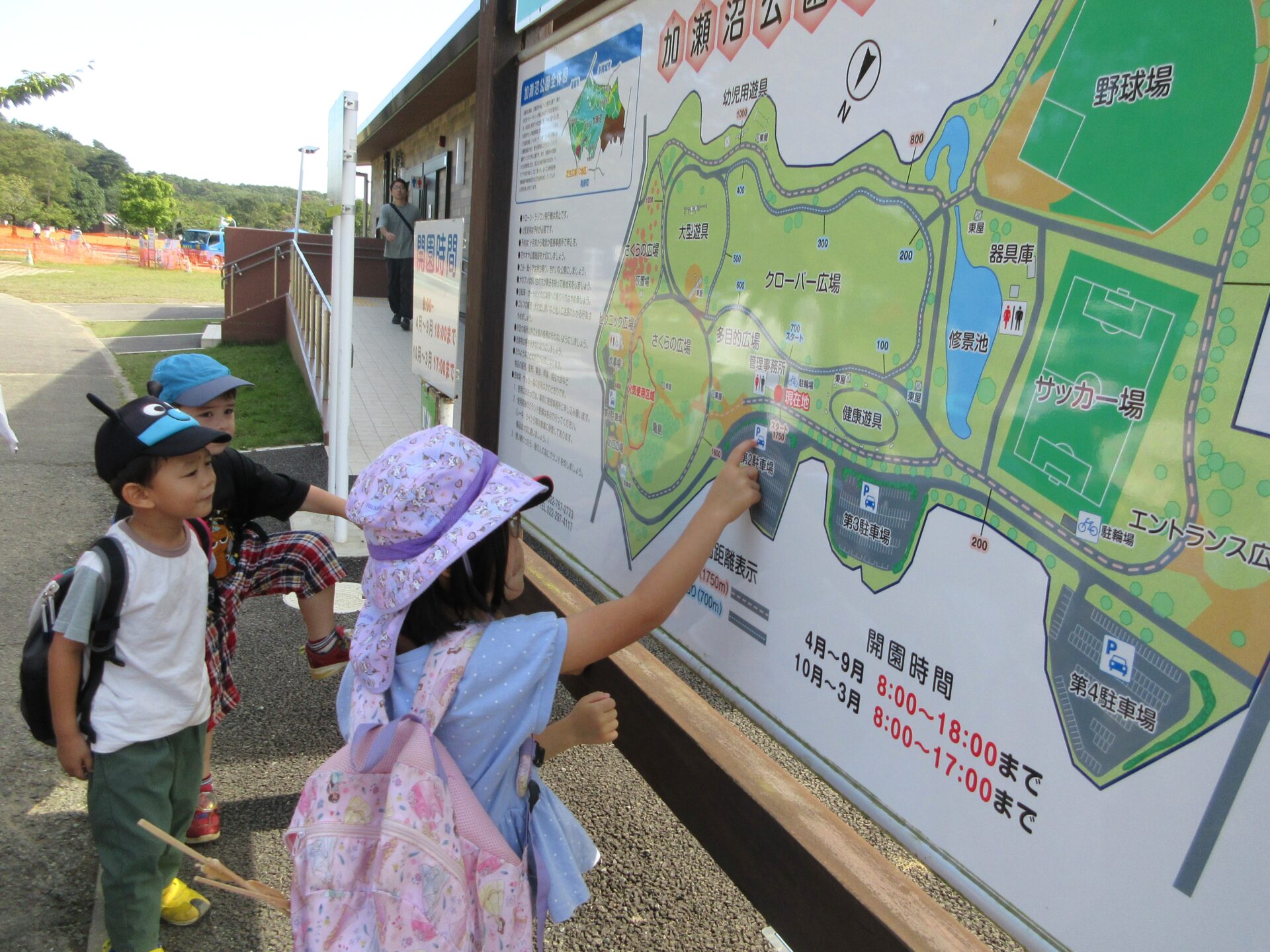 公園に到着後、園内マップを見ながら沼や広場の場所の確認をします。
