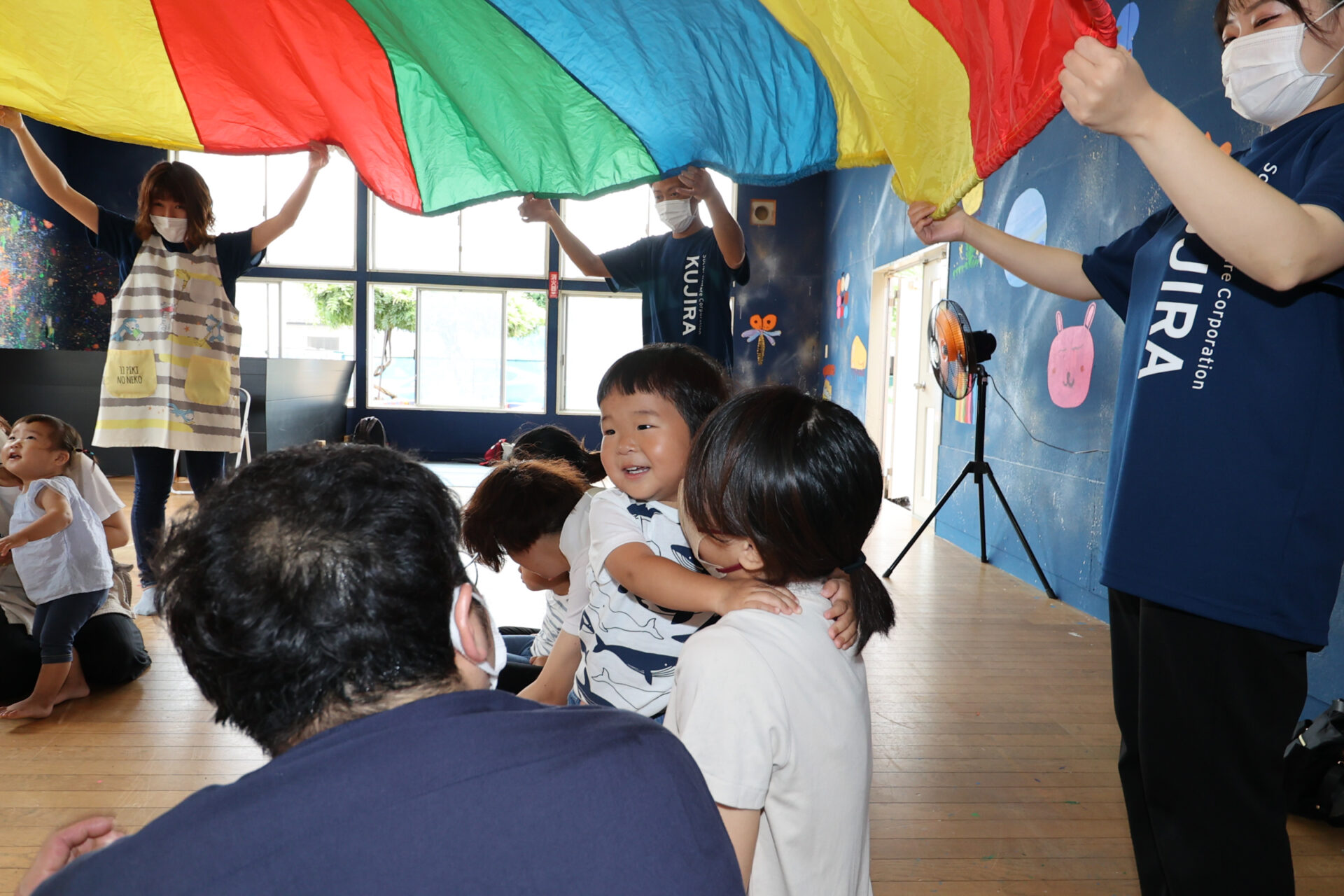また、普段、子どもたちが楽しんでいる大布遊びを、お家の方と一緒に体験していただきました。
