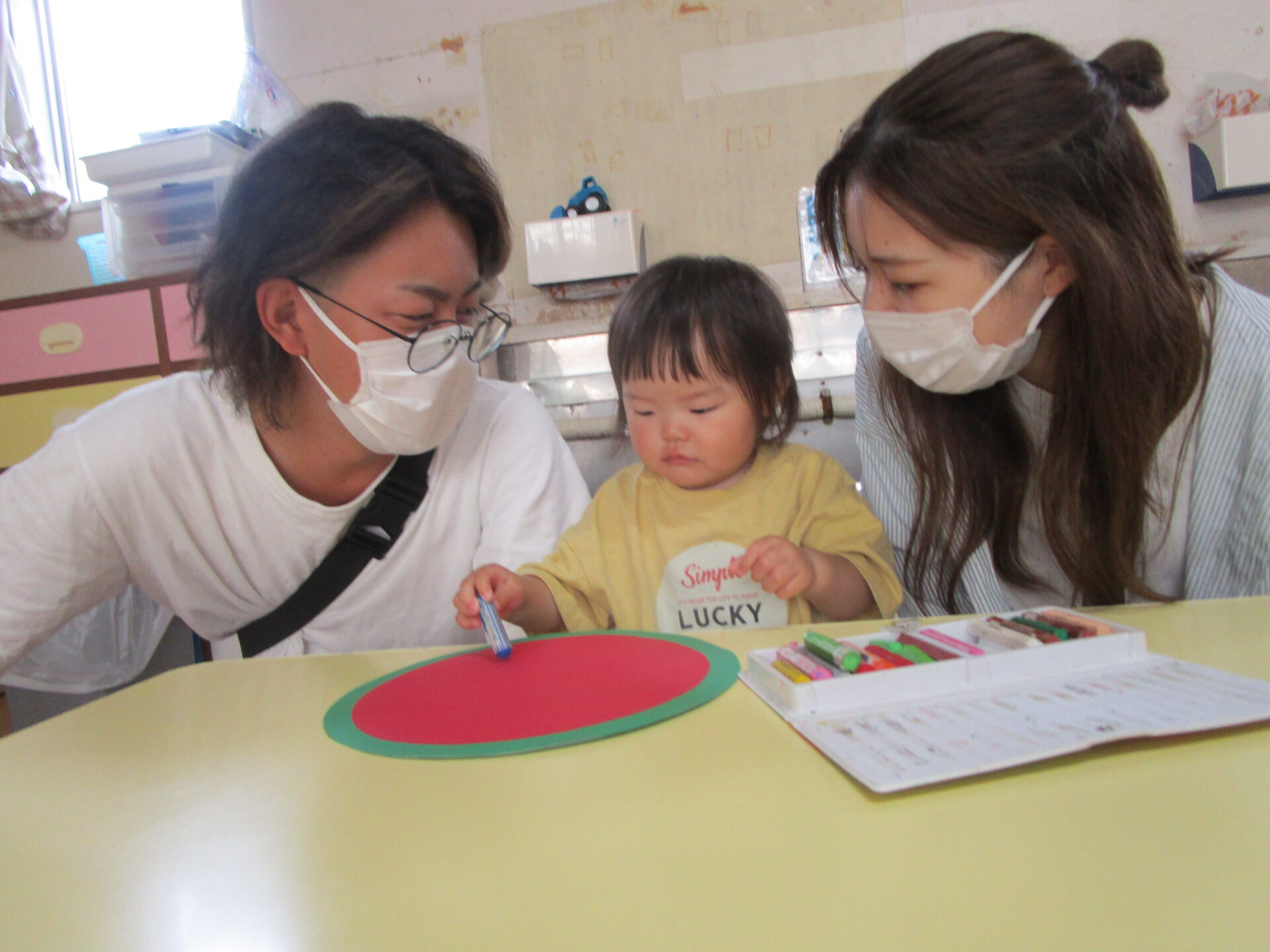 制作では子どもたちが普段楽しんでいるクレヨンでのお絵かきとシール貼りを親子一緒に行いました。
