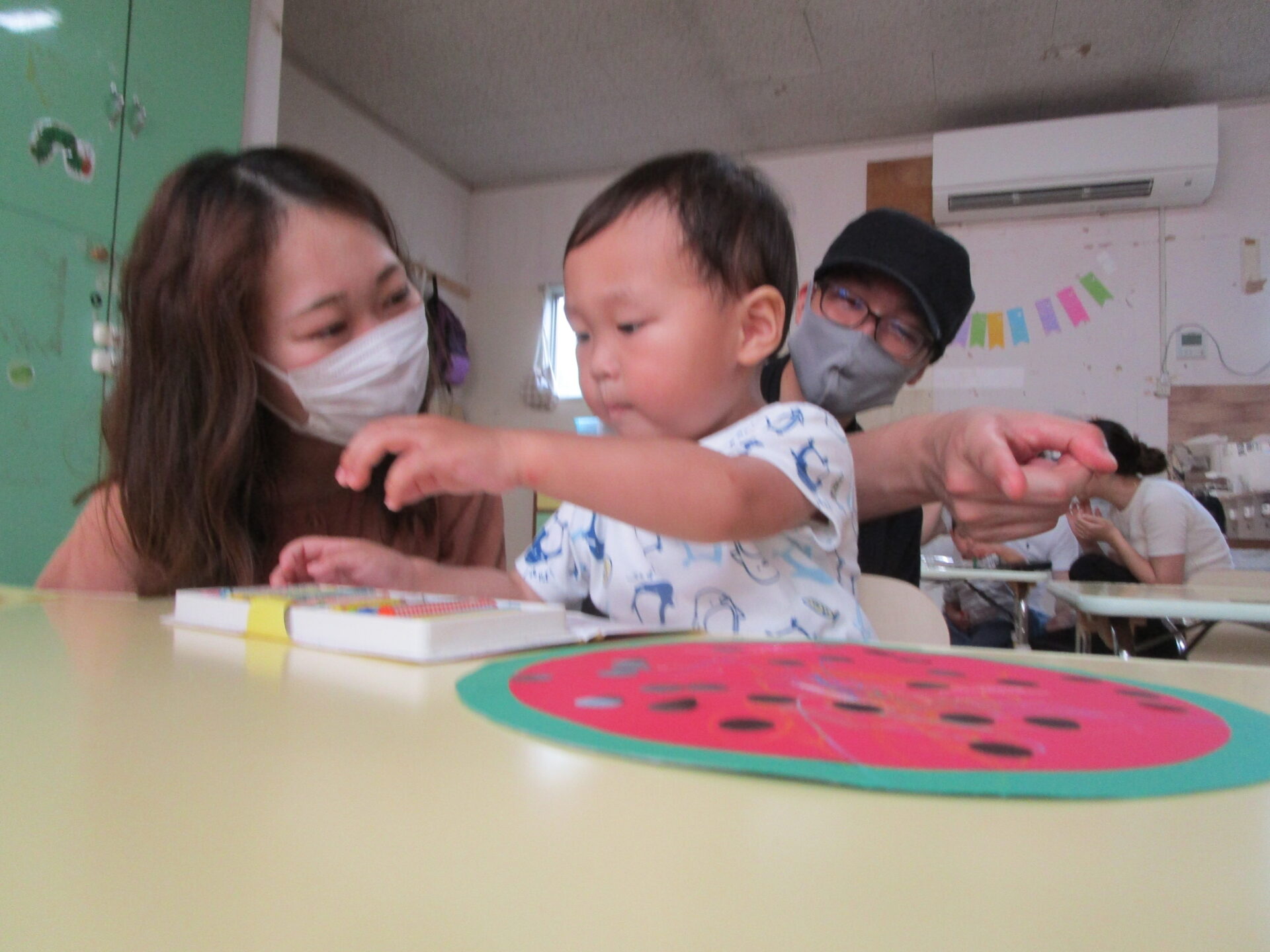 1歳児クラスの親子レクリエーションは、熱中症対策のためホールと保育室の2グループに分かれて行いました。