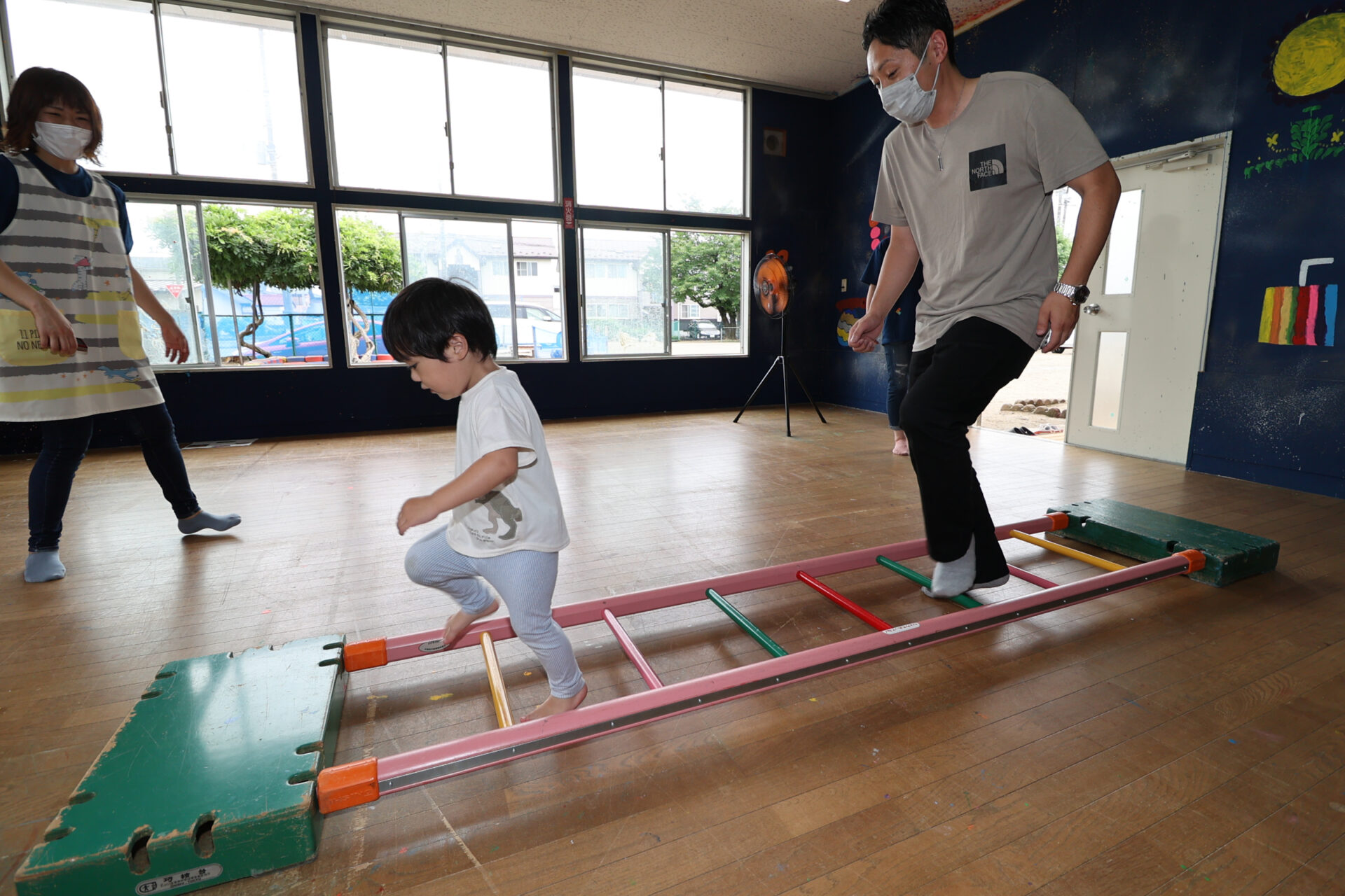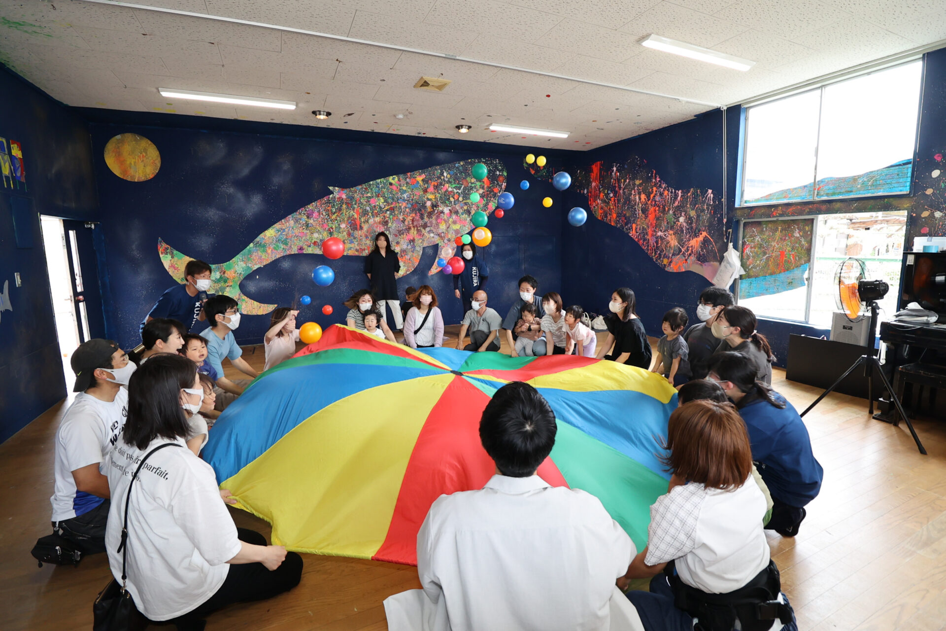 「親子で遊んでバイバイしよう」と計画したホールお別れ会。2歳児クラスもホールだけではなく、保育室も使って、ホールでのバルーン遊びとアスレチック、保育室でマラカスづくりと魚つり遊びを行いました。