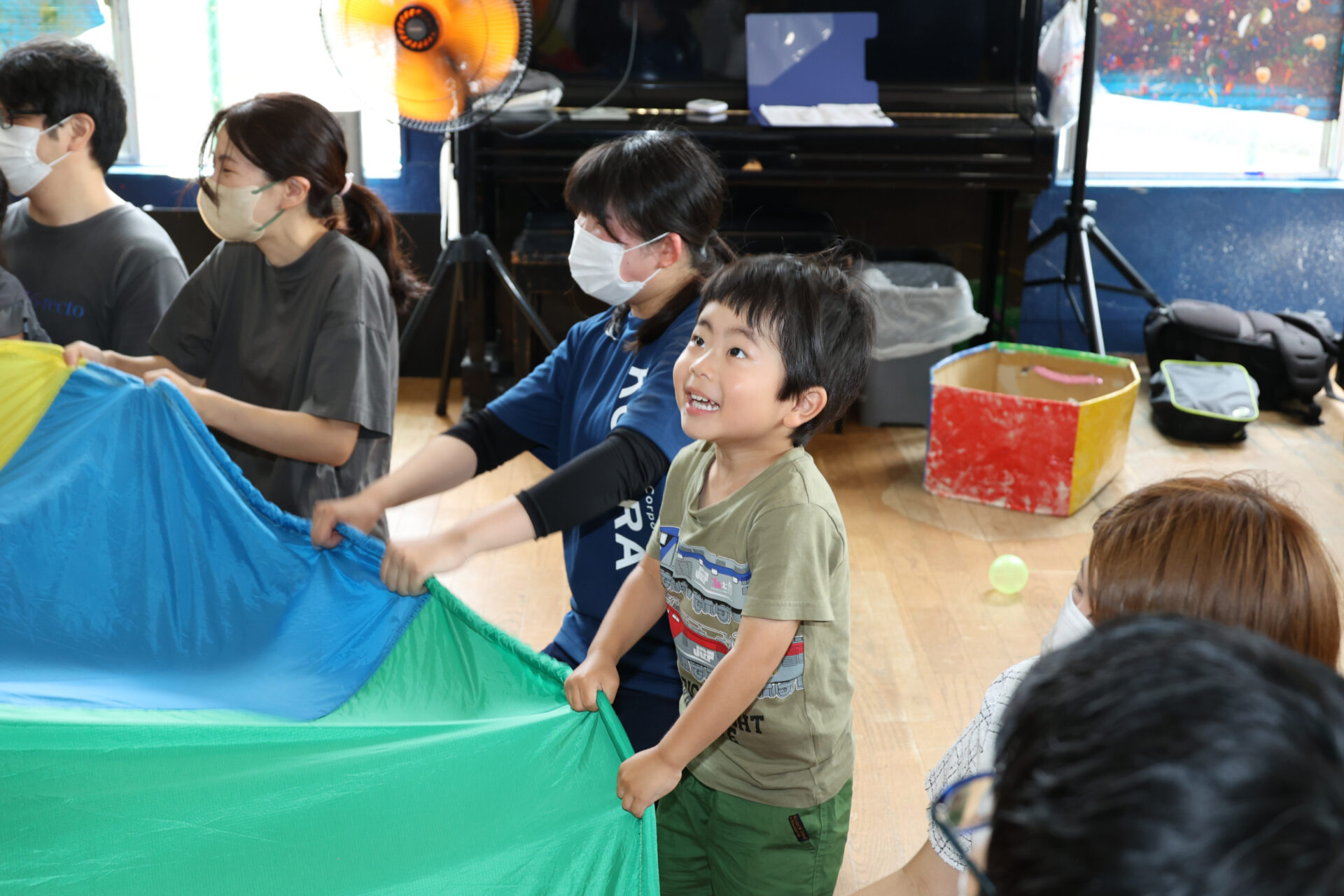 最後にお家の方々に協力していただき、ボールを上に飛ばす際には、タイミングの違いでいろいろな方向に飛んでしまう場面もありましたが、クラスの一体感が感じられ、楽しいひとときでした。