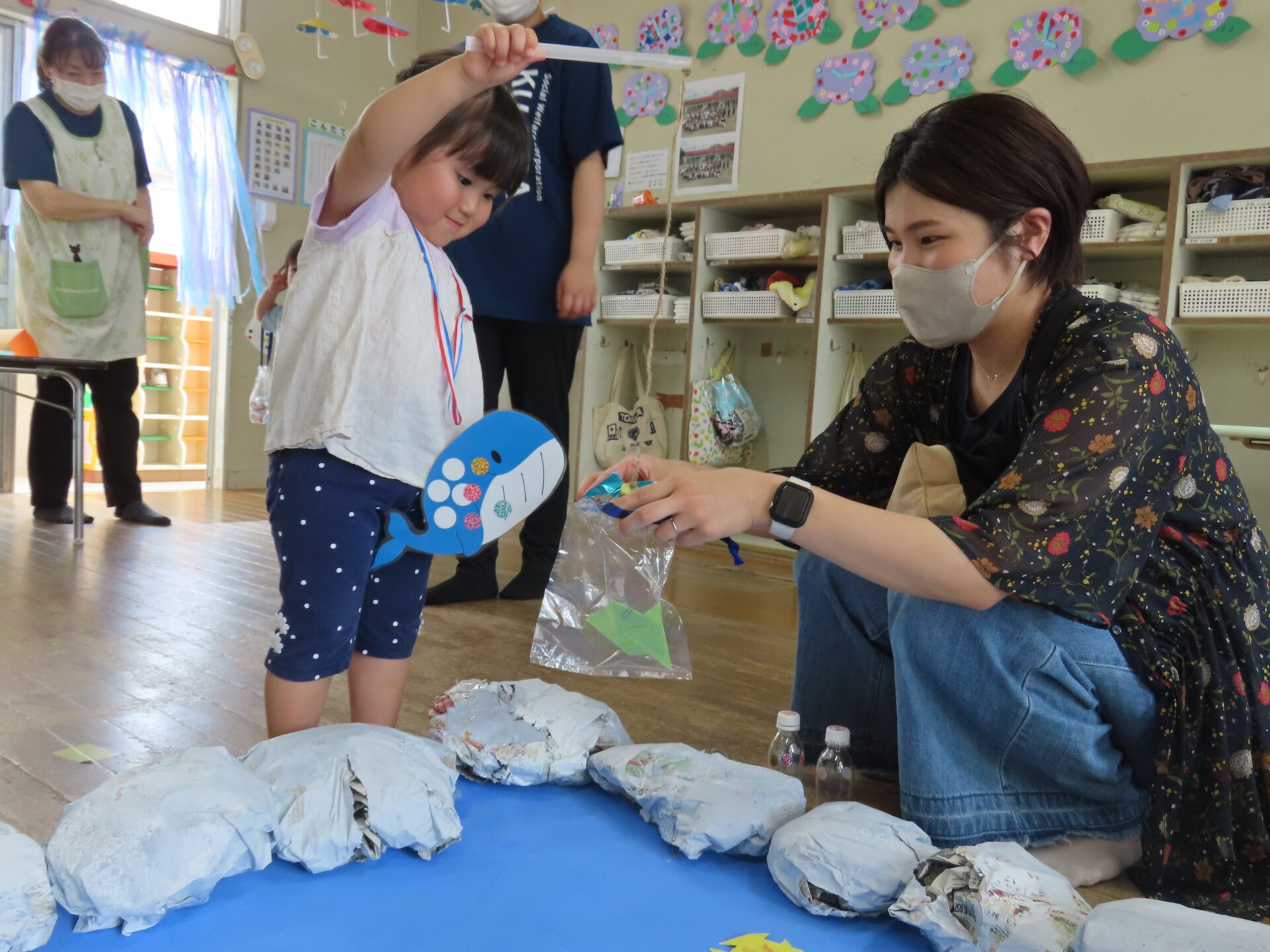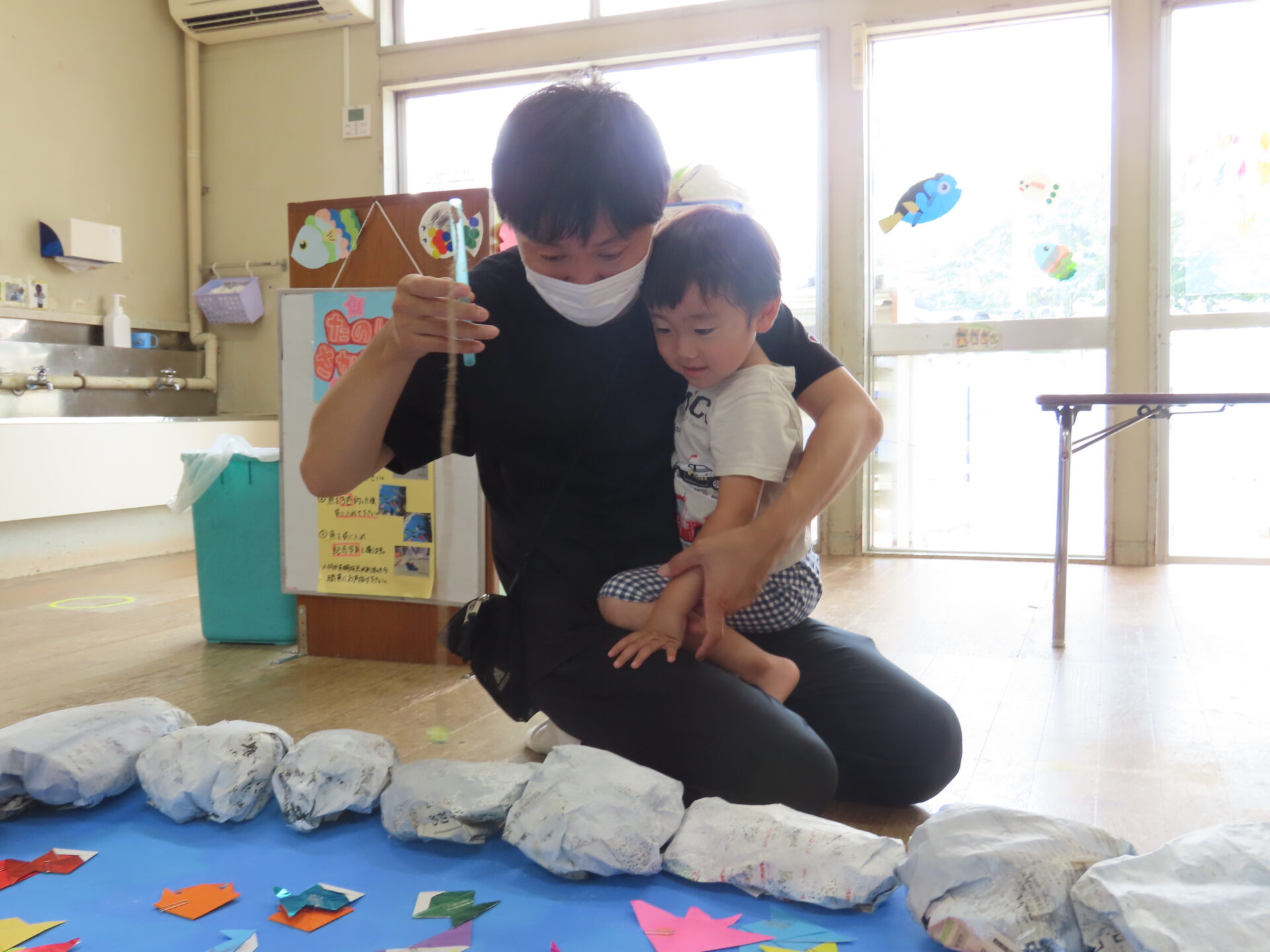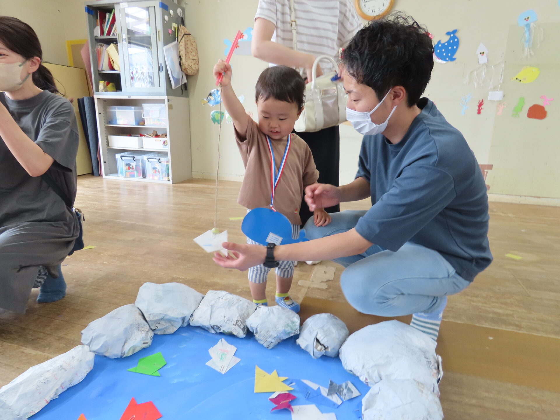 魚釣りコーナーの「海と岩」は、子どもたちと一緒に色遊びを楽しんで準備しました。