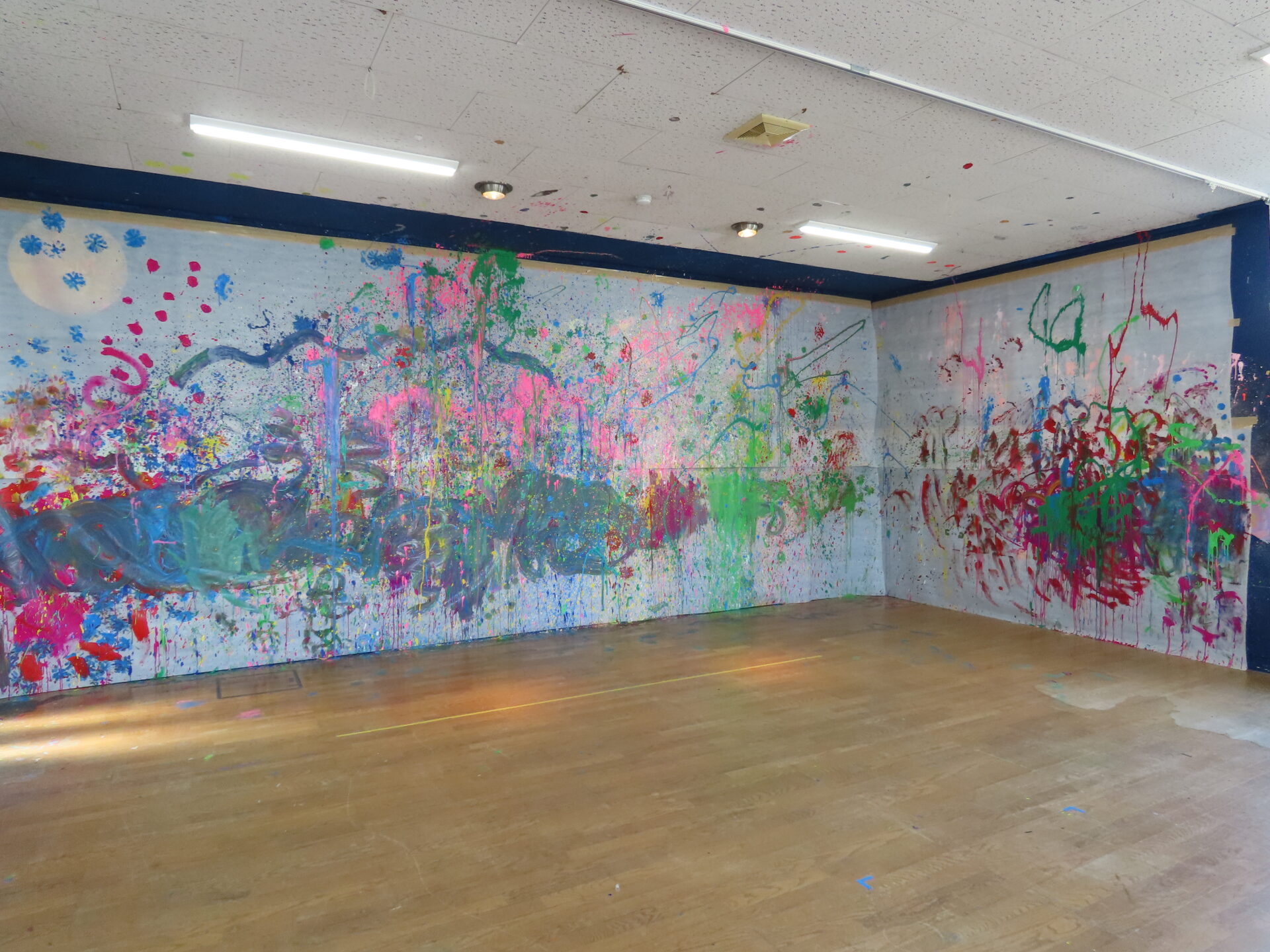 遊戯室解体工事前、遊戯室壁面へは最後のアート活動。