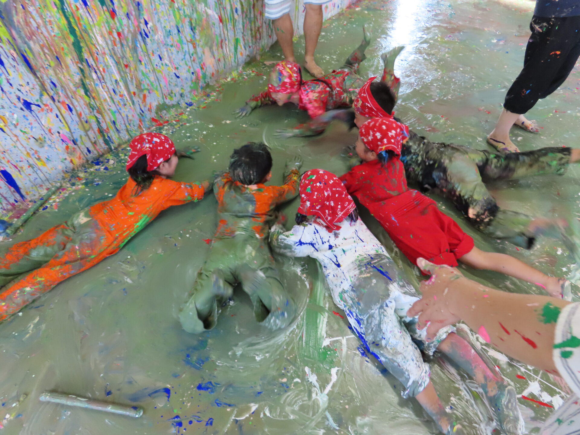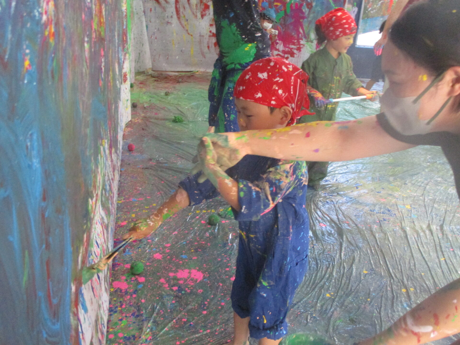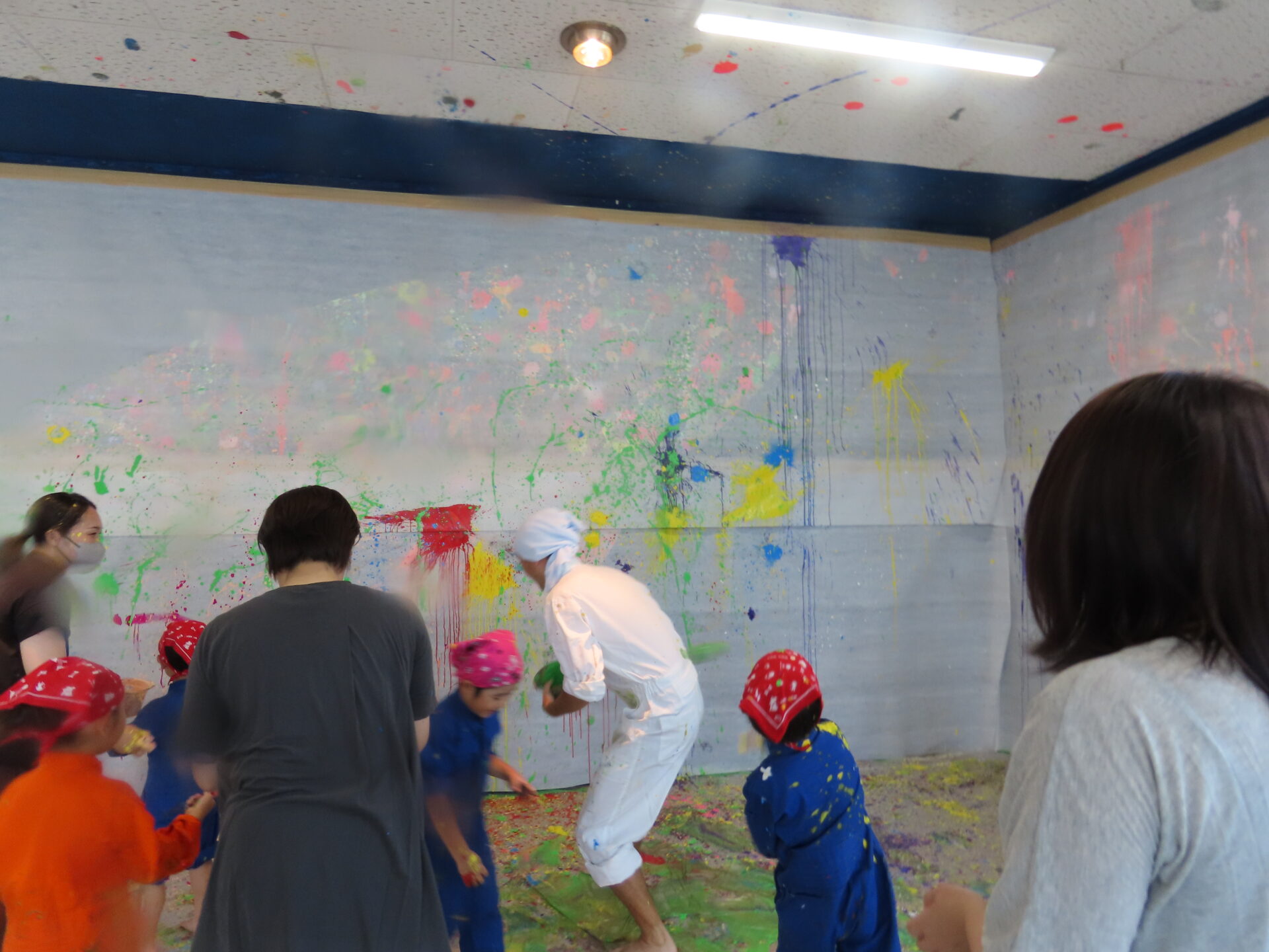 絵の具入り水鉄砲は壁面だけではなく、天井に向かって飛ばしたり、最後ならではの絵の具遊びを楽しみました。