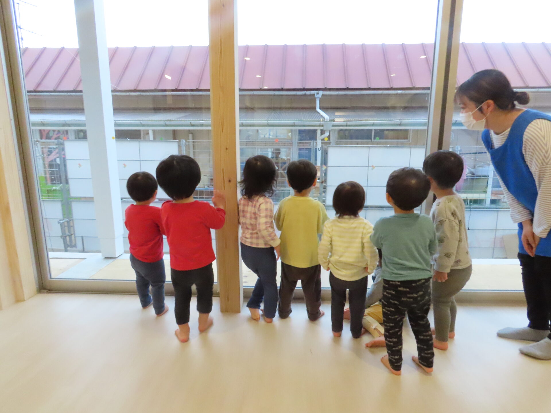 こどもたちは木の温もりを感じながら、園舎内を探検することや生活を楽しむ姿が見られています。
