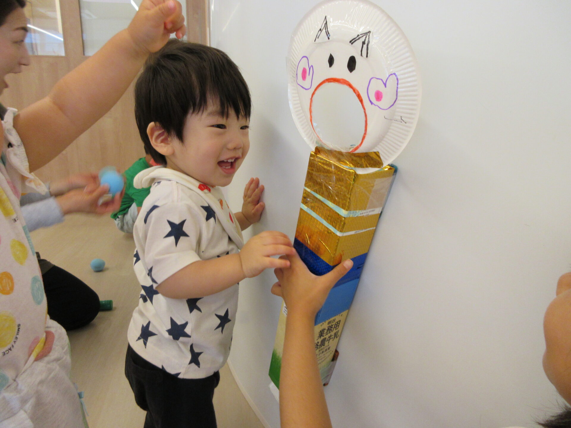 くじら組(5歳児)のこどもたちが手作りのおもちゃを作り、だいち組(0・1歳児)のこどもたちに持ってきてくれました。