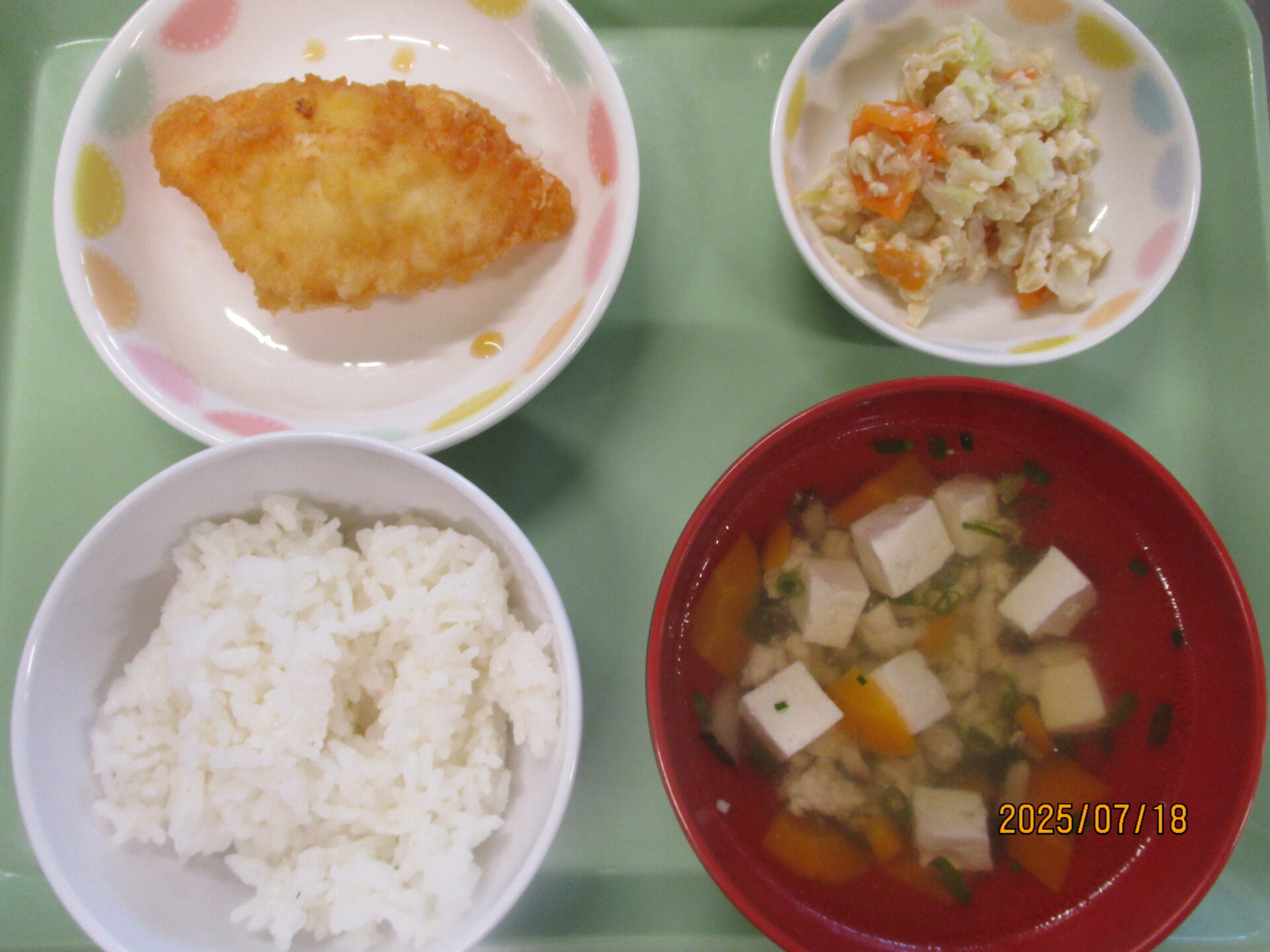・魚の天ぷらかぼすソース・かしわ汁・ビーンズサラダ・ごはん